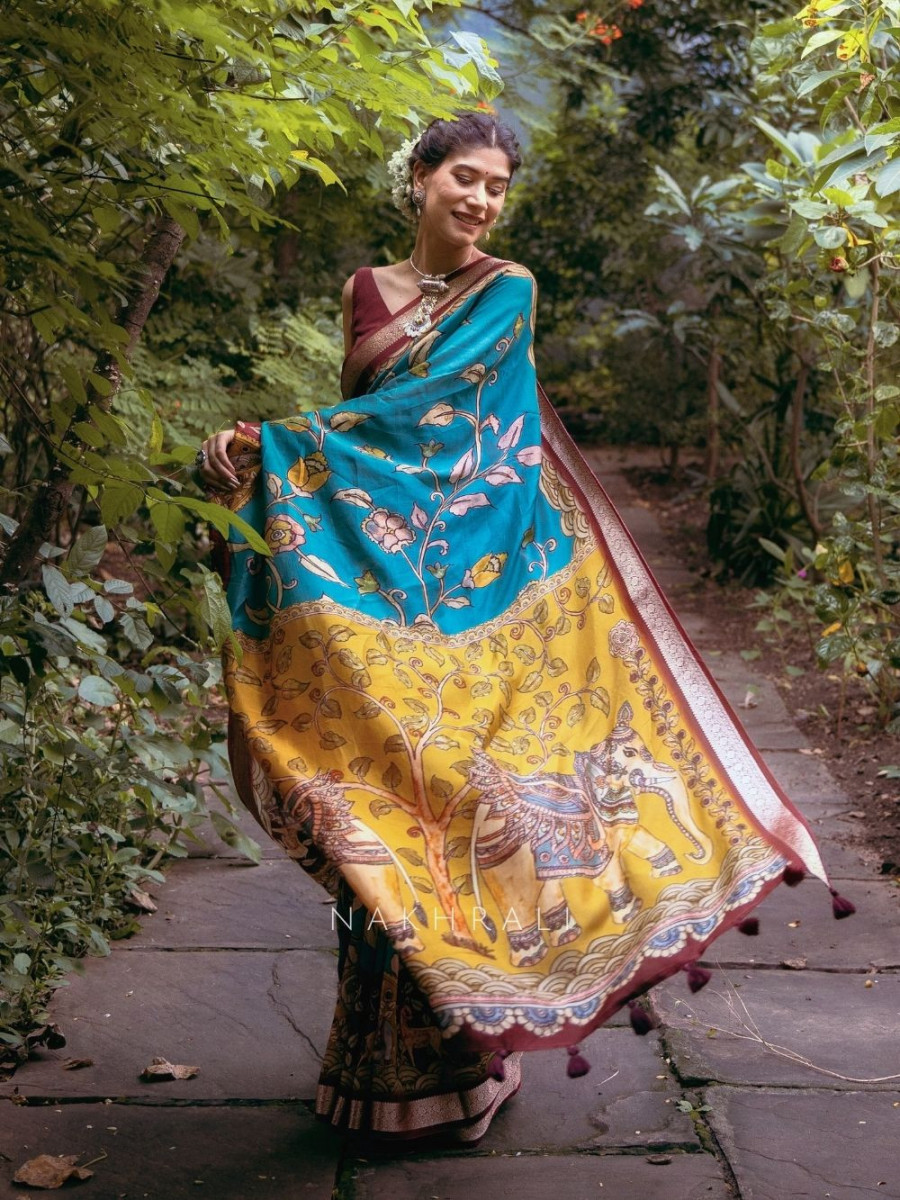 https://www.nakhrali.com/products/tanirika-blue-kalamkari-saree#595-Rajtilak043