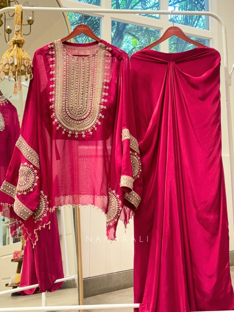 Fusion Fuchsia Wine Indo-Western Set with Zari and Mirror Work