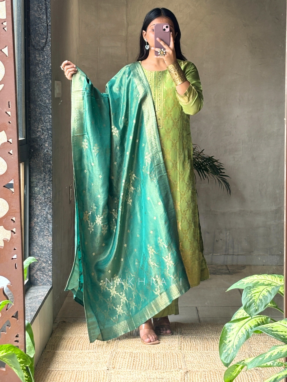 Step into timeless grace with this pista green kurta pant set, exquisitely woven with golden zari detailing. The straight-fit kurta features subtle embroidery on the neckline and sleeves, balanced with solid silk pants for refined comfort. The highlight is the lustrous teal dupatta, intricately adorned with floral zari work and bordered edges, creating a regal contrast. Perfect for festive occasions, wedding celebrations, and elegant gatherings, this ensemble embodies the richness of Indian craftsmanship with a modern silhouette.