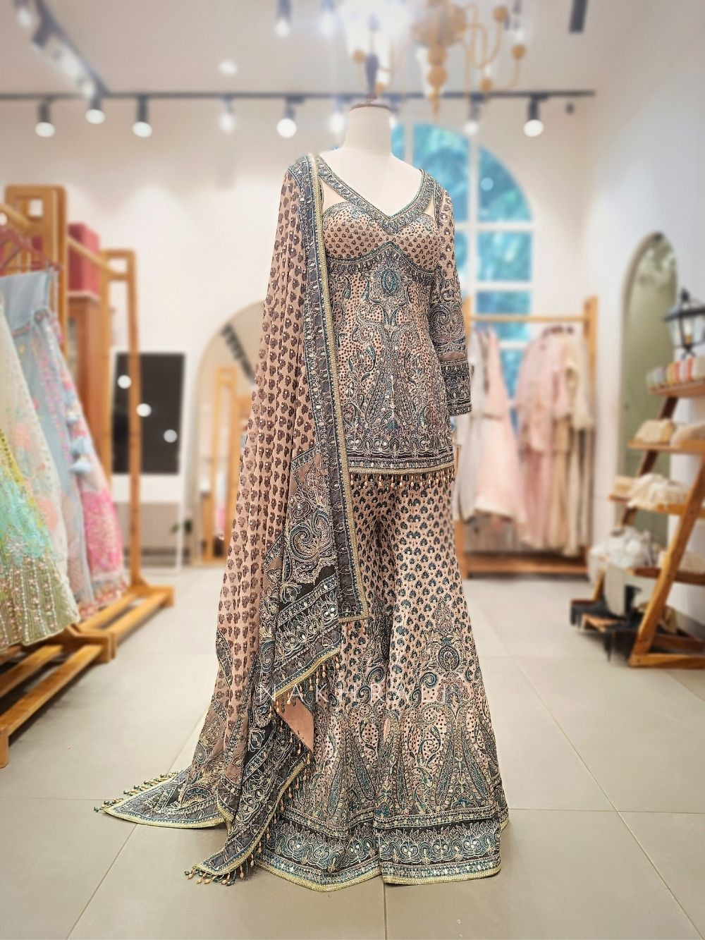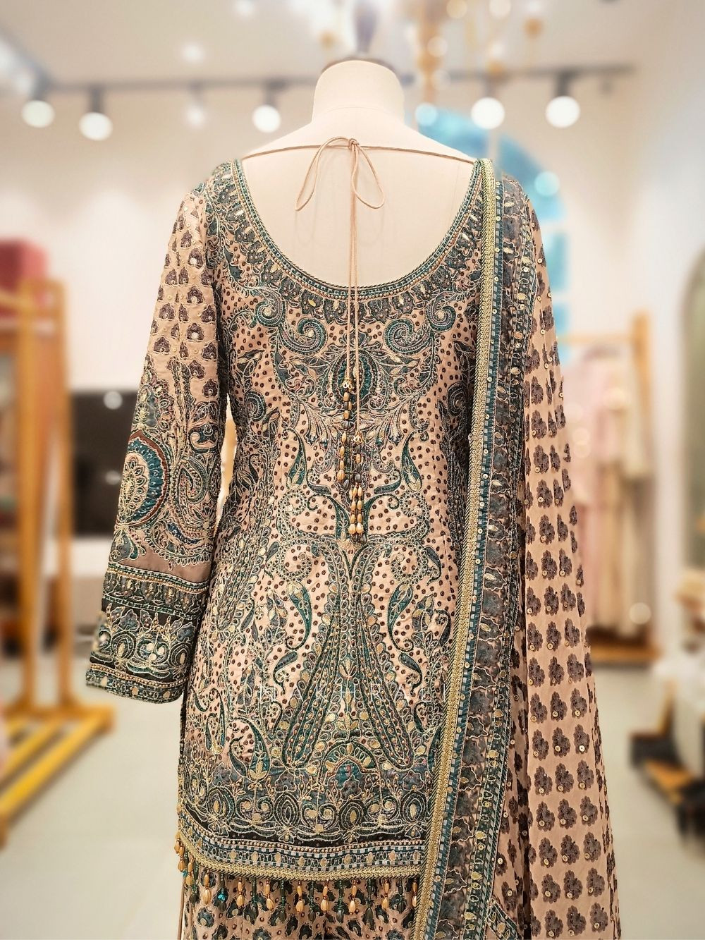 This beige gharara suit set blends traditional artistry with modern charm through its detailed stone work and gracefully designed neckline. The kurta showcases a flattering silhouette with hand-detailed patterns, paired with a beautifully flared gharara featuring complementing motifs. A soft, matching dupatta completes the look, making it ideal for festive functions, intimate celebrations, and elegant evening gatherings.