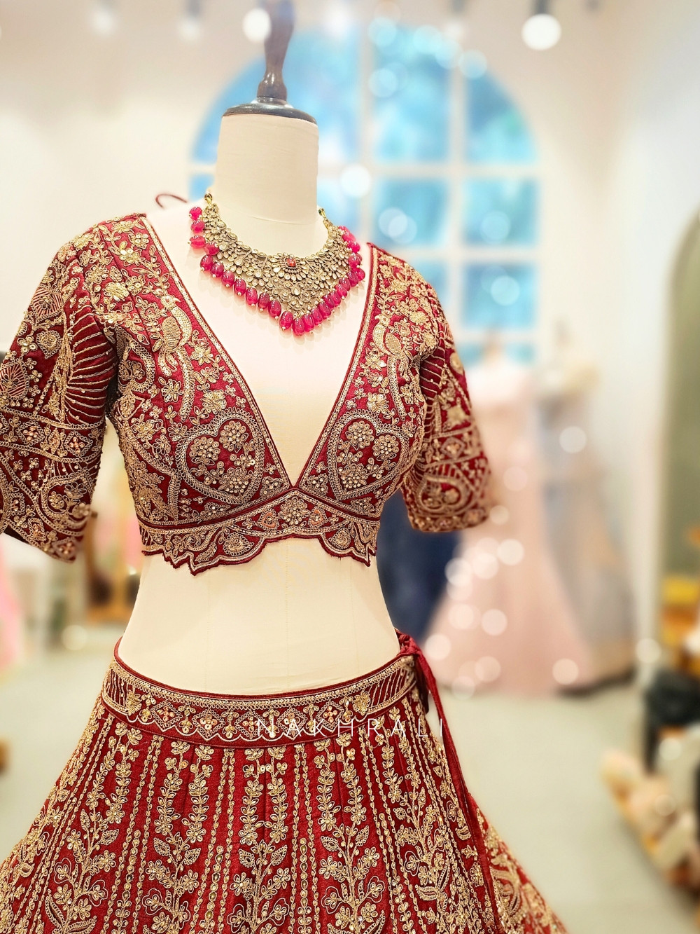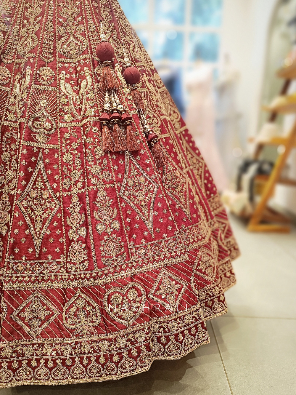 Aarini Maroon Velvet Bridal Lehenga with Zardozi Embroidery