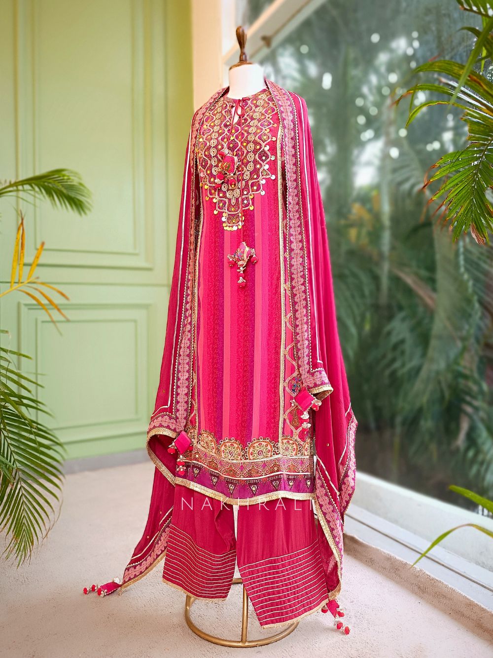 Step into timeless elegance with this Aarohi Red Cotton Suit Set, designed to blend tradition with comfort. Crafted in breathable cotton, the kurta showcases intricate embroidery work around the neckline and hem, beautifully highlighted by traditional prints in rich hues. The palazzo pants feature delicate striped detailing, adding a subtle modern twist. A complementing dupatta with embroidered borders completes the ensemble, making it perfect for festive occasions, wedding functions, or cultural gatherings.