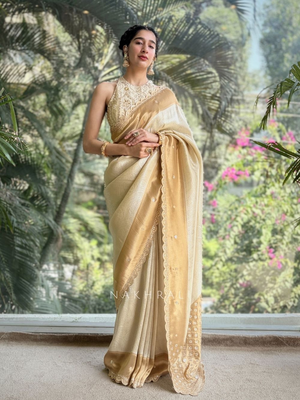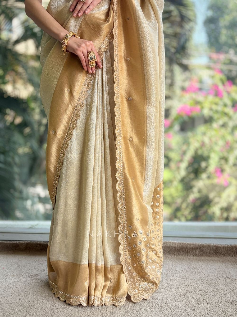 Aarshika Beige Silk Saree with Gota Zari Pallu