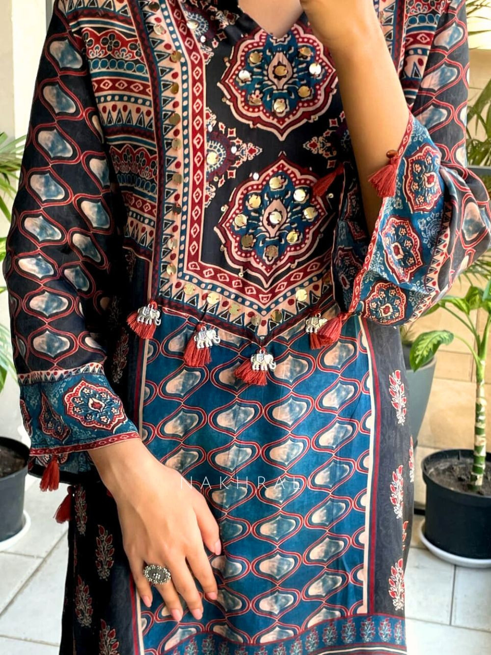This Aaruni Black Powder silk Kurta Pant Set with Sequin Detail blends luxurious comfort with refined craft. Made from soft modal fabric, the kurta showcases rich digital prints in blue, rust, and ivory tones, highlighted with delicate sequin accents for a subtle festive sparkle. The relaxed straight-fit pants complete the look with matching printed borders. Perfect for casual outings, get-togethers, or light festive days, this set offers a stylish, breathable, and effortlessly graceful vibe.