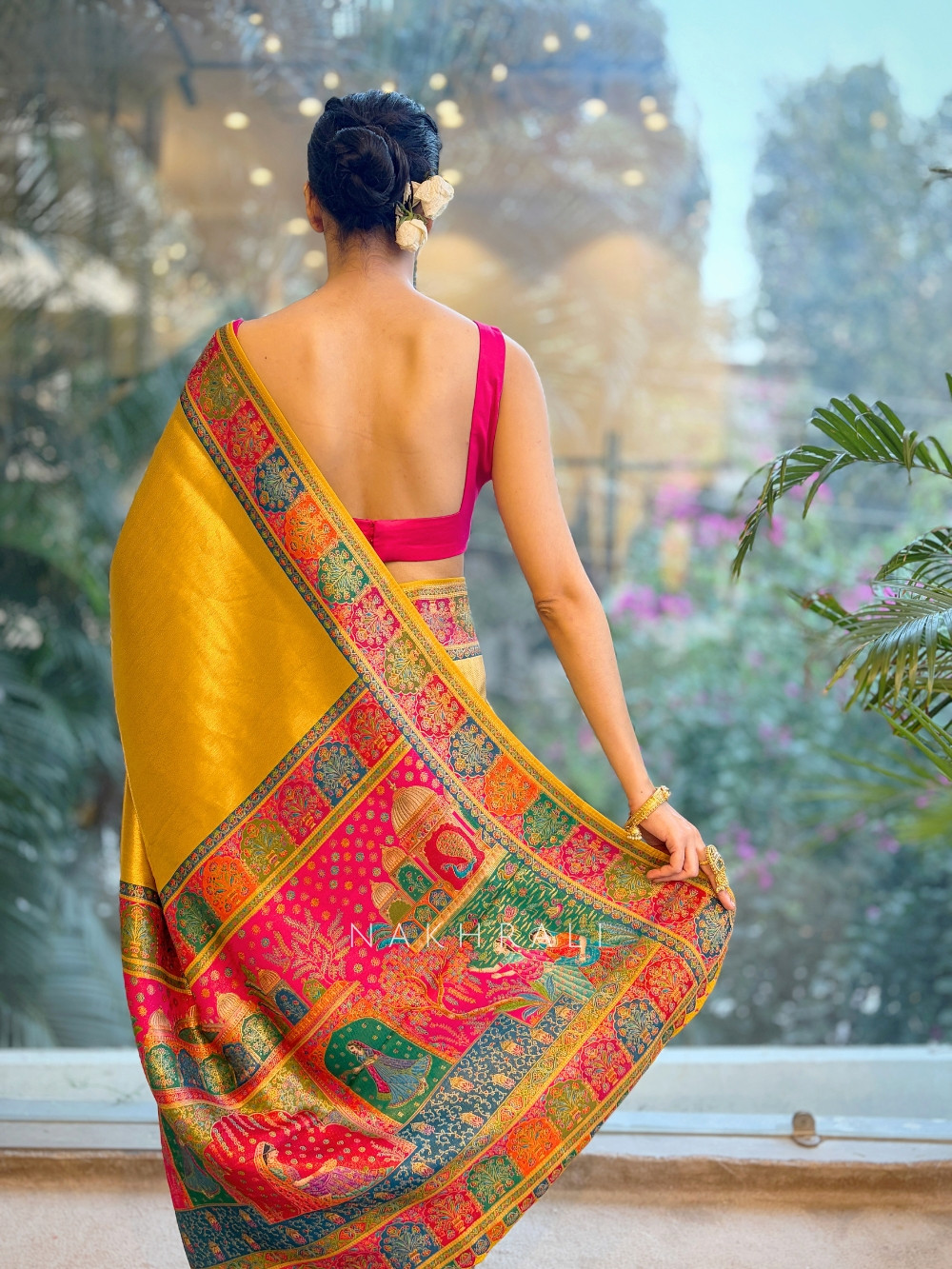 The Aarunika Mustard Banarasi Silk Saree with Heritage Weave Work radiates royal opulence through its timeless craftsmanship. Woven in pure silk, the saree showcases intricate Meenakari-inspired designs depicting traditional Indian motifs and cultural tales. The rich mustard base is accentuated by vibrant tones of red, green, and blue, creating a striking harmony. Ideal for weddings, festive occasions, and grand celebrations, this saree is a true heirloom piece exuding grace and grandeur.