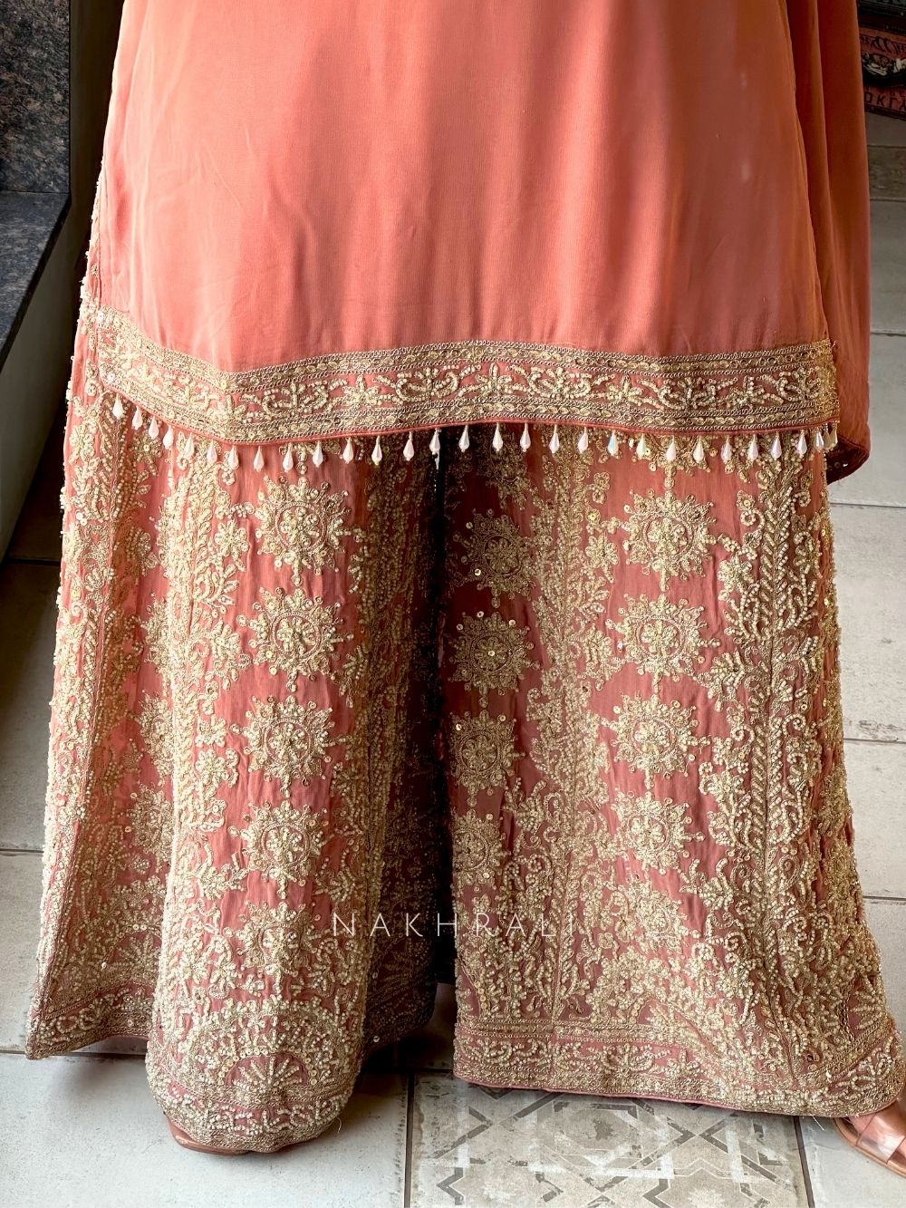 The Aarunya Peach Palazzo Kurta Set is a graceful ensemble crafted in fine georgette, beautifully detailed with intricate zari and sequin embroidery. The kurta features elaborate work on the neckline and sleeves, paired with a heavily embroidered palazzo that exudes royal charm. Delicate tassel edging enhances the dupatta, completing this luxurious set. Perfect for weddings, festive occasions, and special celebrations, this outfit blends elegance and grandeur in every detail.