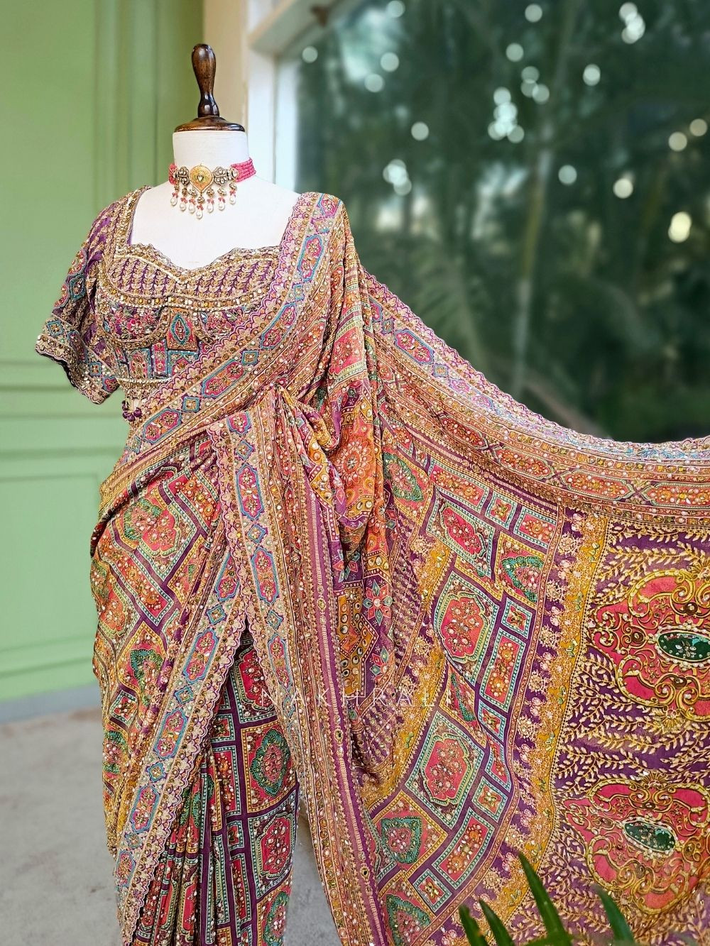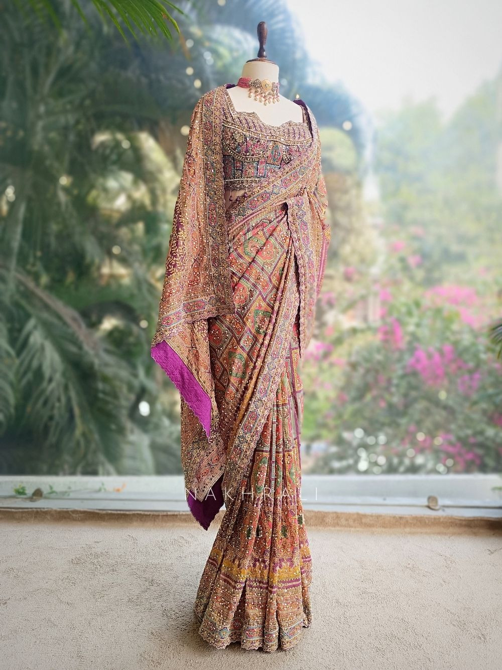 Pair with statement earrings and a sleek bun to let the blouse and saree detailing stand out.