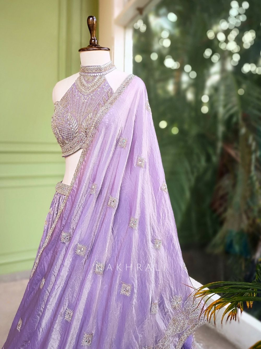 The Aarvi Lavender Embroidered Lehenga Set is a dreamy ensemble that radiates charm and sophistication. Crafted in a soft lavender hue, this lehenga is adorned with all-over mirror and sequin embroidery, adding a subtle shimmer to its flowy silhouette. The halter-neck blouse stands out with detailed bead and mirror embellishments, creating a sculpted and flattering fit. A gracefully bordered dupatta completes the look, making it perfect for wedding receptions, sangeet nights, or grand festive events. Lightweight yet luxurious, this set combines traditional intricacy with contemporary finesse.