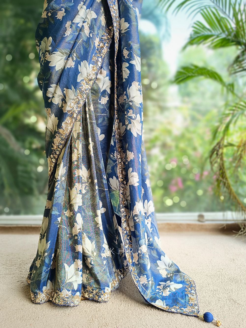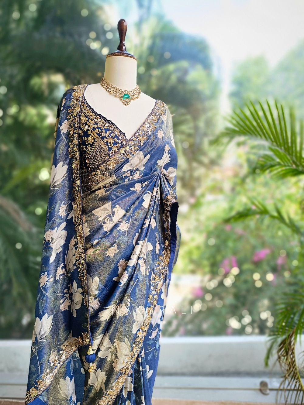Dry clean only. Store in a muslin cloth. Avoid direct sunlight. Handle sequin embroidery gently. Iron on low heat from the reverse side.