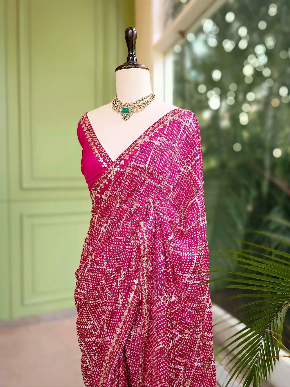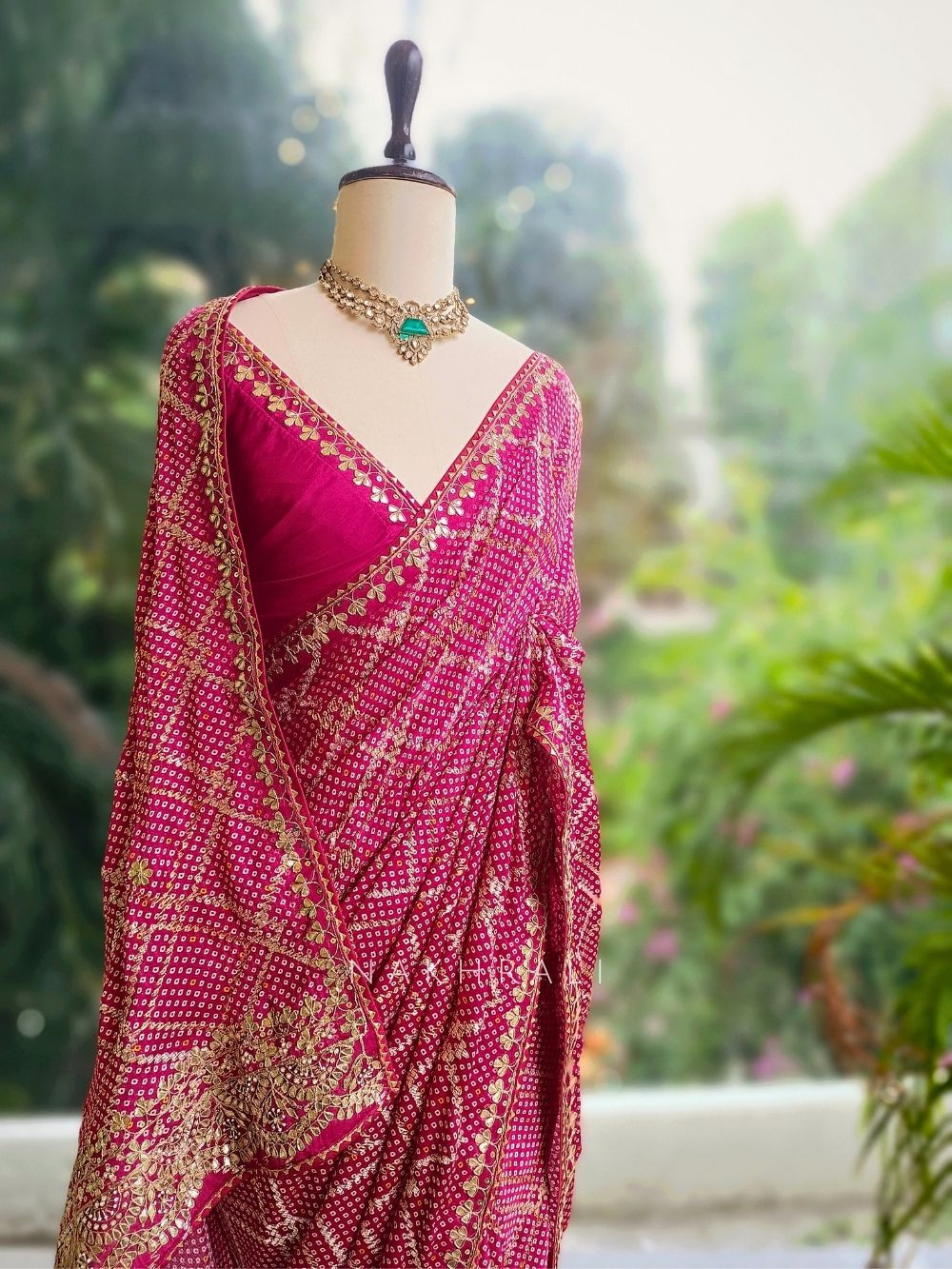 The Aarvika Bandhani Saree celebrates traditional artistry in its most exquisite form. Adorned with detailed gota work that enhances the beauty of its bandhani patterns, this saree radiates festive charm. The shimmering zari border adds a royal finish, making it a perfect pick for weddings, poojas, or celebrations. Whether in magenta or red, each hue exudes cultural richness, grace, and sophistication that defines heritage Indian wear at its finest.