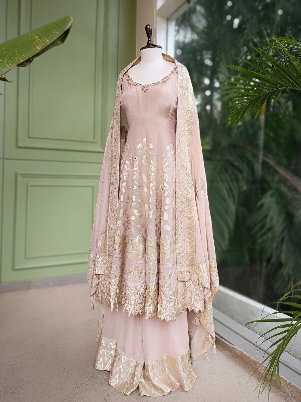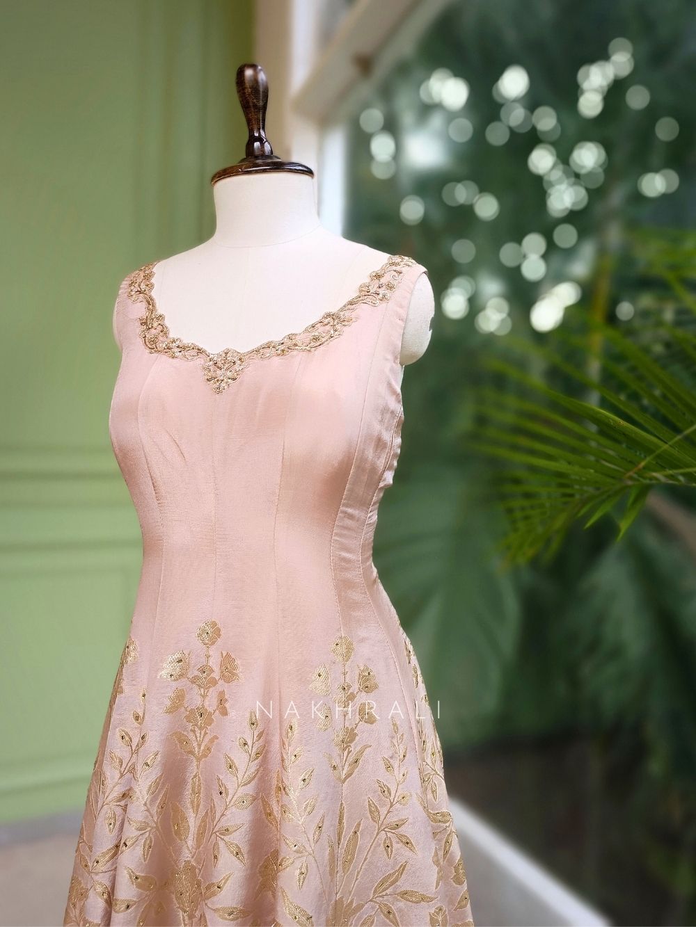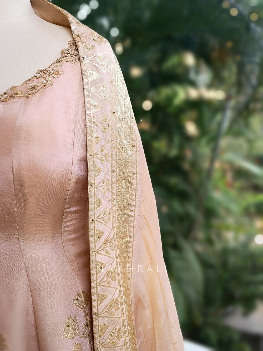 Dry clean only to maintain the zari’s shine. Store in a muslin cloth when not in use. Avoid direct exposure to sunlight. Handle delicately to prevent snagging. Do not iron directly over embroidery.