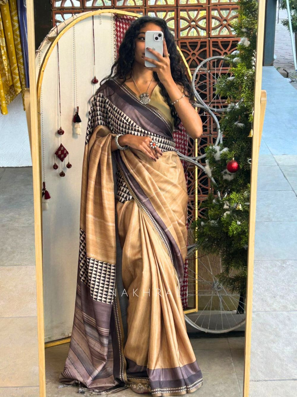 The Aavya Grey Printed Silk Saree embodies timeless sophistication through its minimalist design and soft texture. Crafted from luxurious silk, it features delicate geometric-inspired prints in soothing grey tones, exuding quiet elegance and refined taste. Lightweight yet luxurious, this saree drapes effortlessly, making it an ideal pick for festive evenings, office gatherings, or day-to-night celebrations. A perfect harmony of modern artistry and traditional grace.