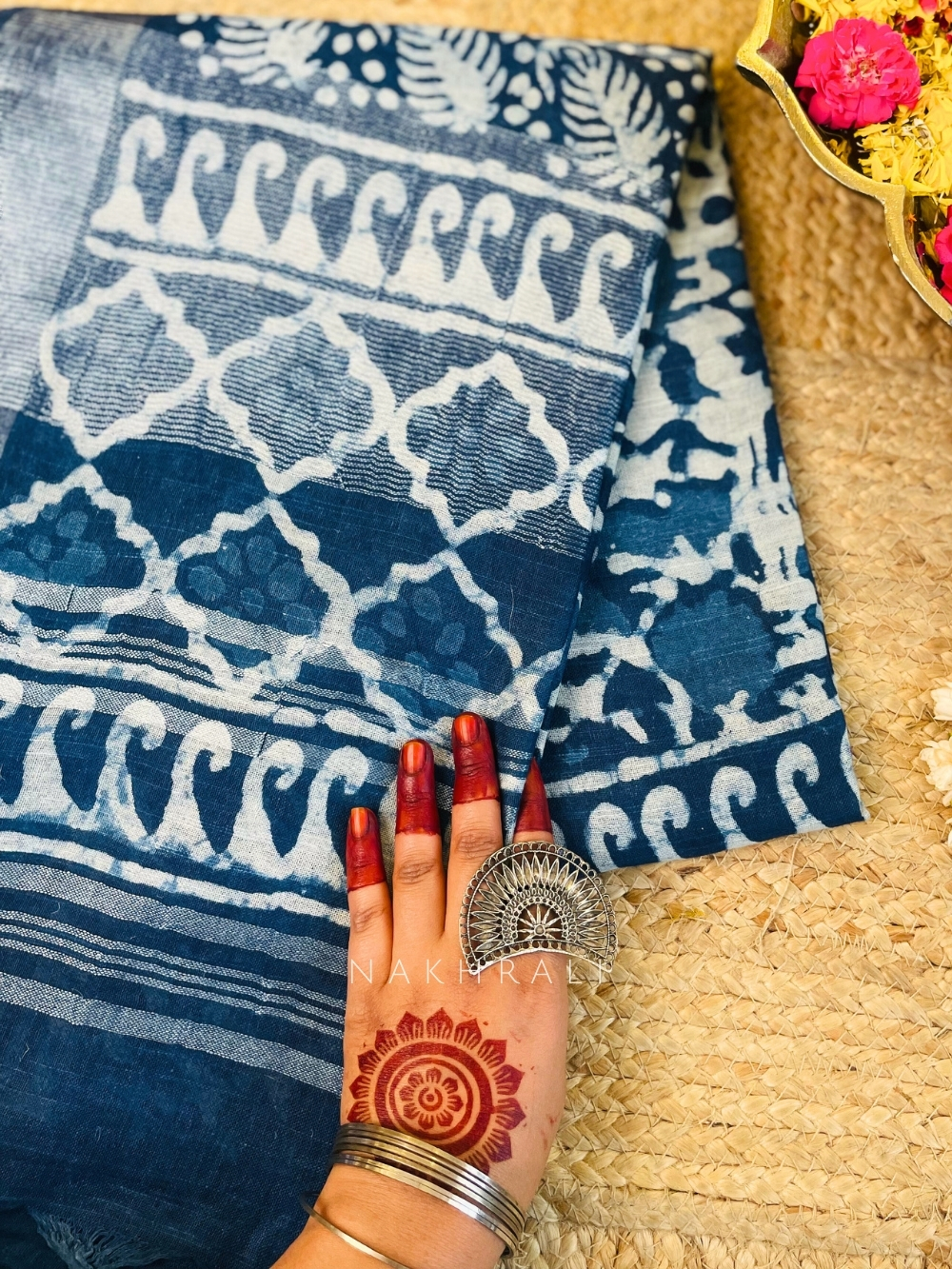 Aayra in blue brings together the lightness of Chanderi with the freshness of minimal prints. The fabric’s natural sheen and airy drape make it ideal for day functions, poojas, or elegant everyday wear. The soft blue tone adds calm sophistication, while the subtle print lends a refined charm. Whether styled simply or dressed up with statement pieces, Aayra offers comfort, tradition, and beauty—woven into one graceful silhouette.