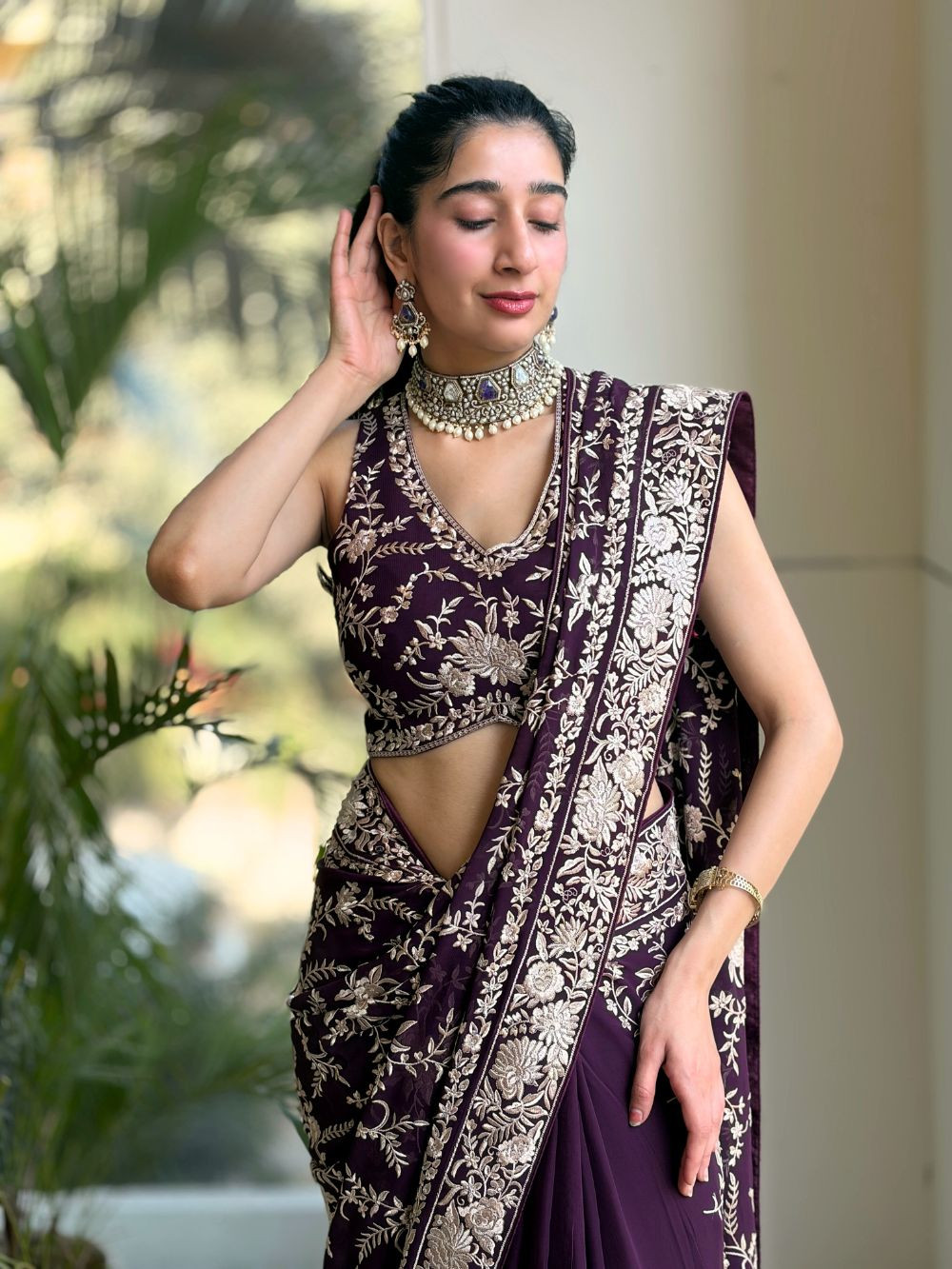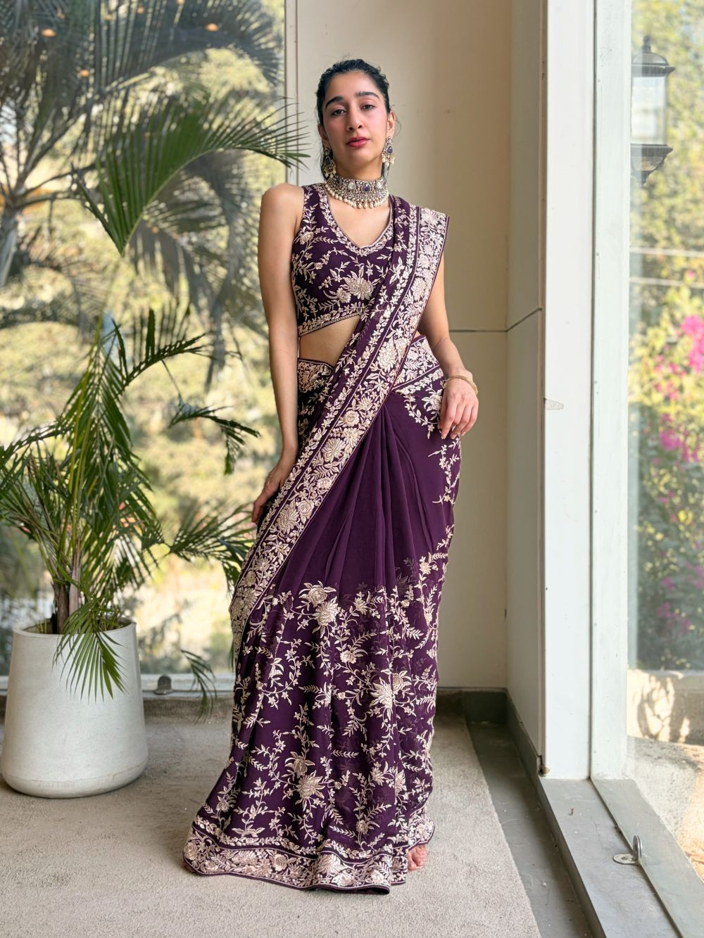 This wine georgette saree is designed for refined occasions where elegance matters. The saree features intricate embroidery spread evenly across the drape, creating a rich yet balanced look without appearing heavy. The fluid fall of georgette enhances movement while maintaining structure. It comes with a matching readymade blouse adorned with complementary embroidery, ensuring a polished and hassle-free ensemble. Ideal for festive gatherings, evening celebrations, and formal events where subtle luxury is key.