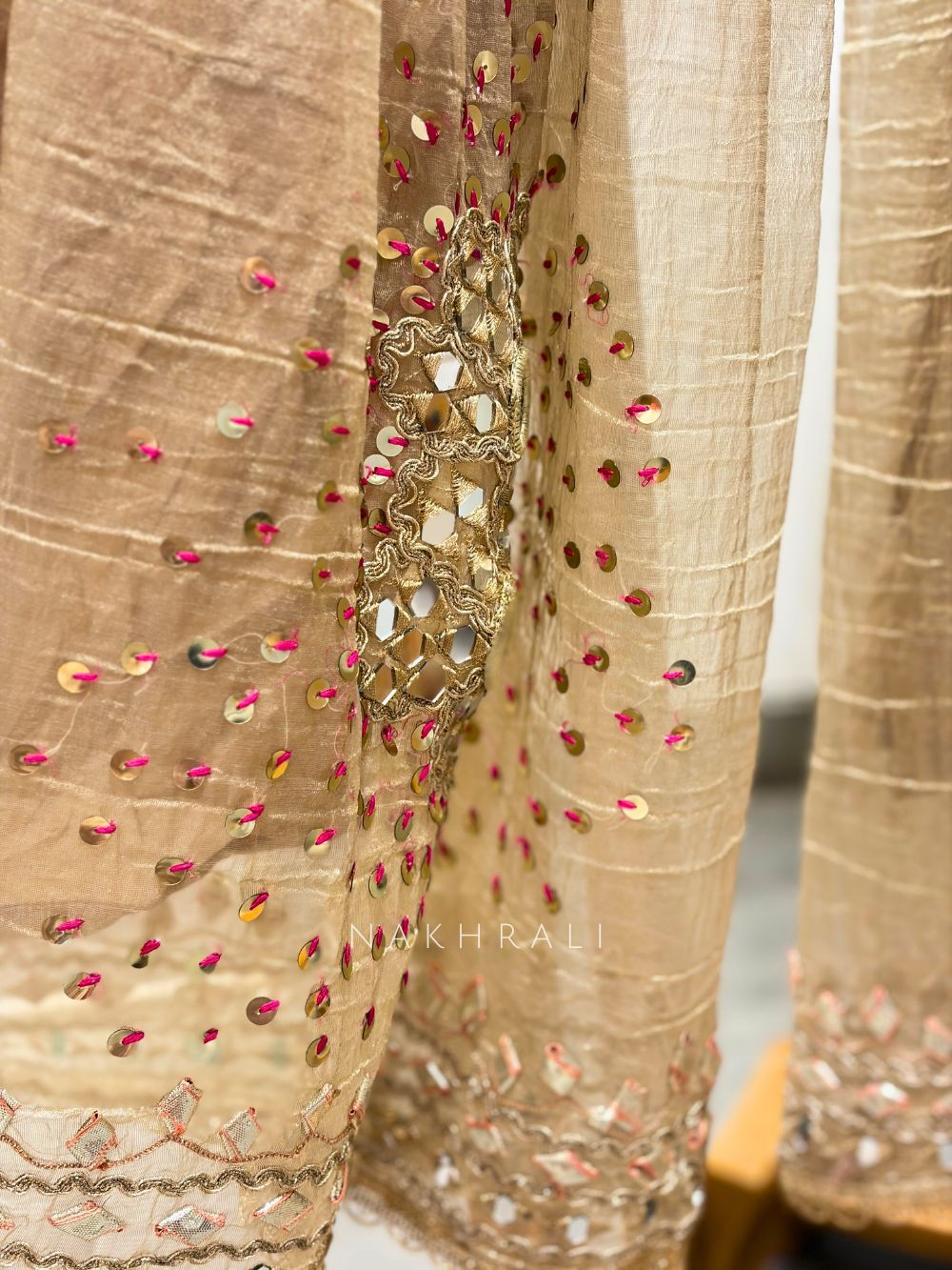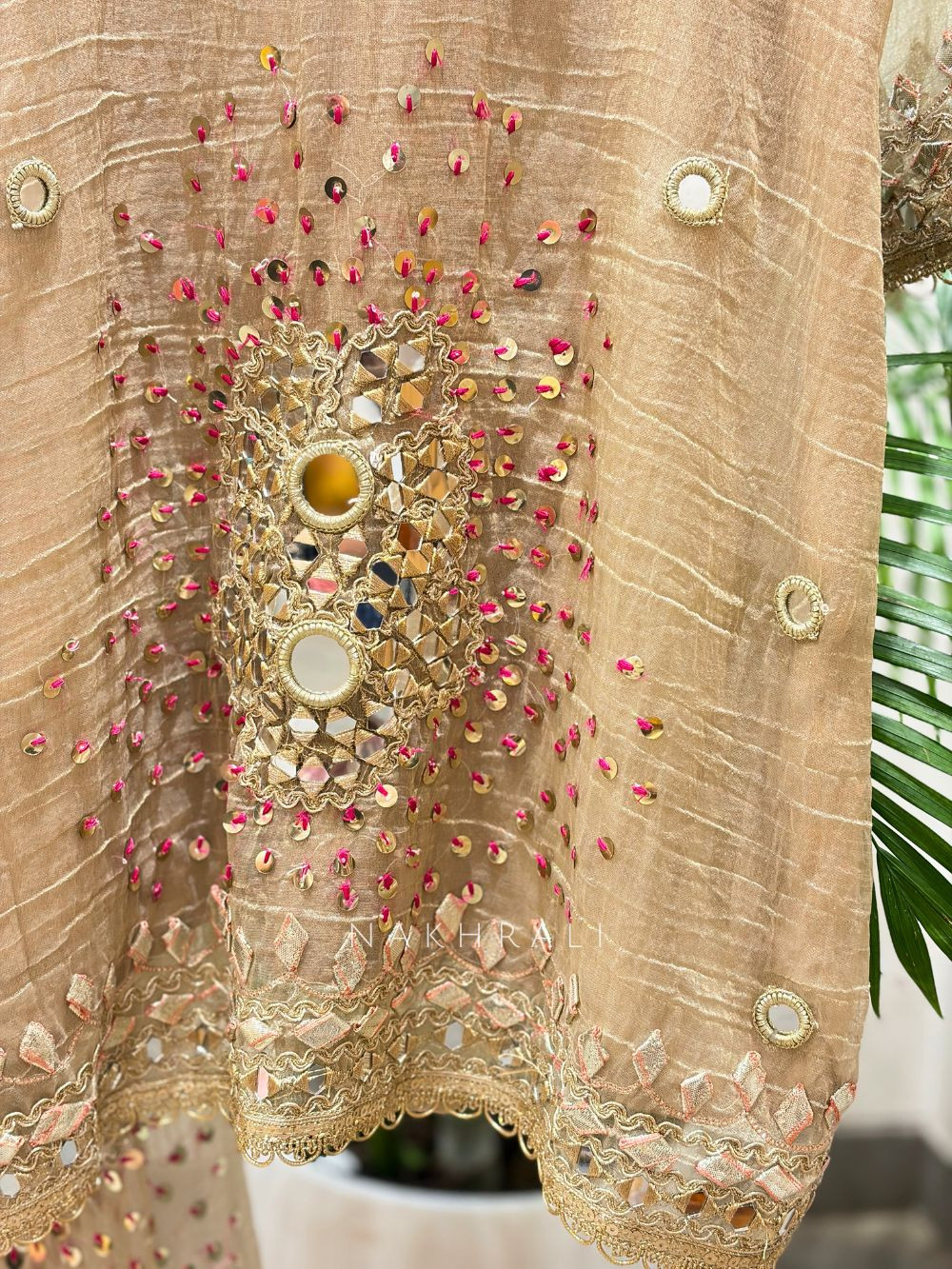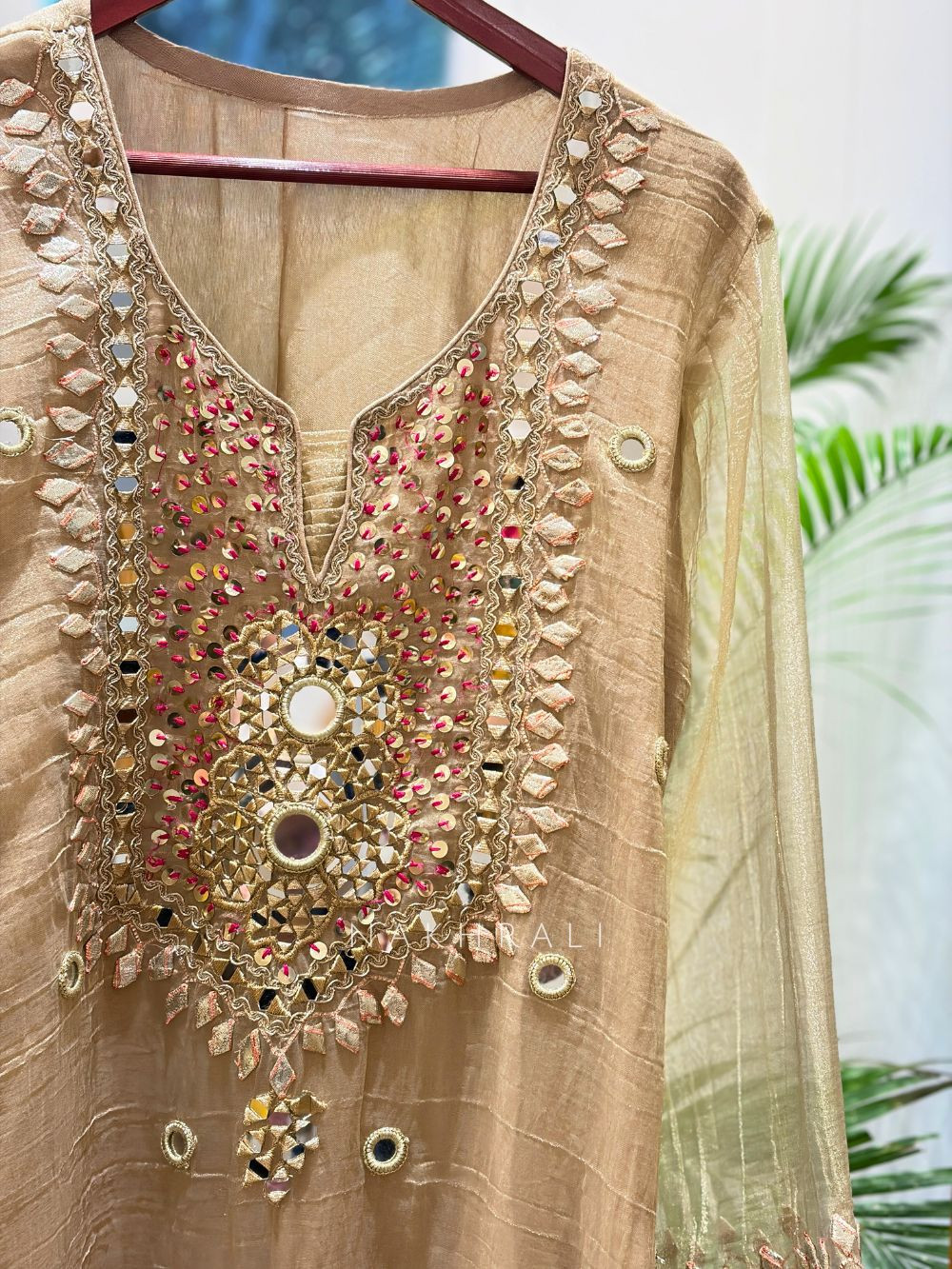 Aisha Beige Tissue Suit Set with Mirror and Gota Patti Work