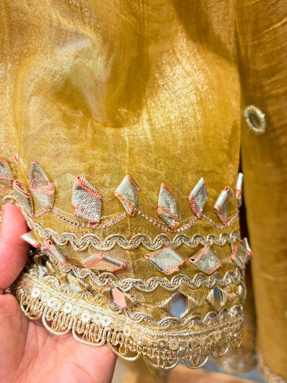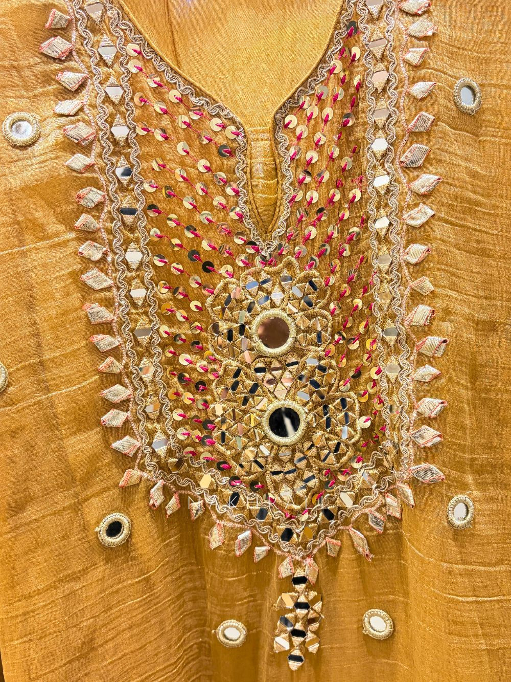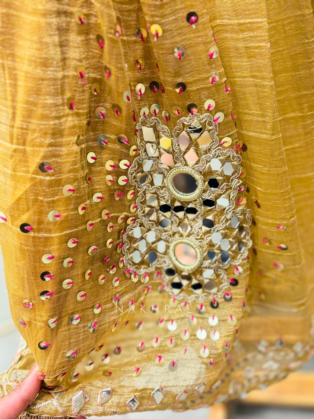 Aisha Mustard Tissue Suit Set with Mirror and Gota Patti Work