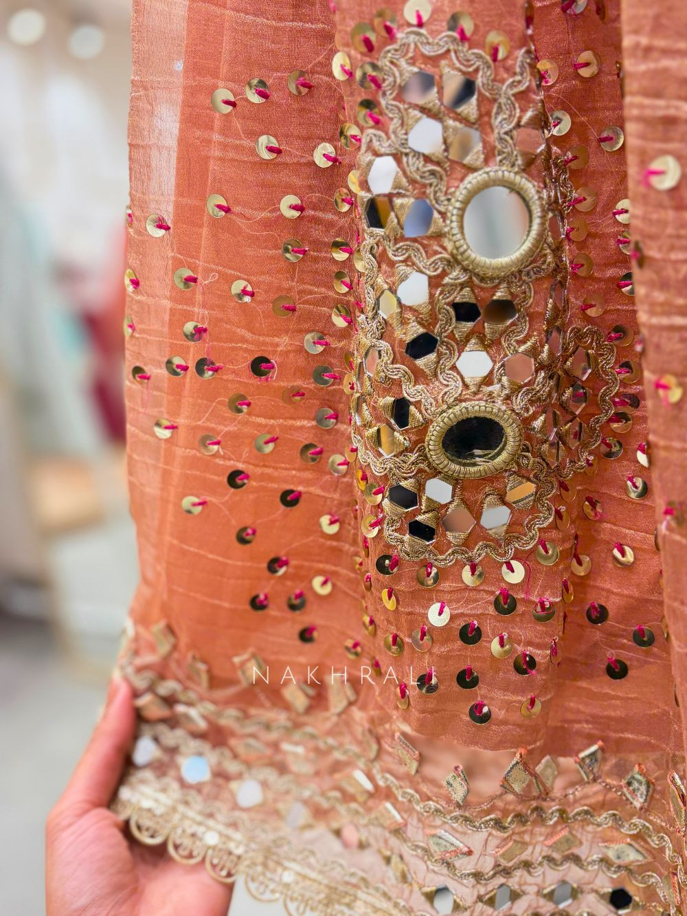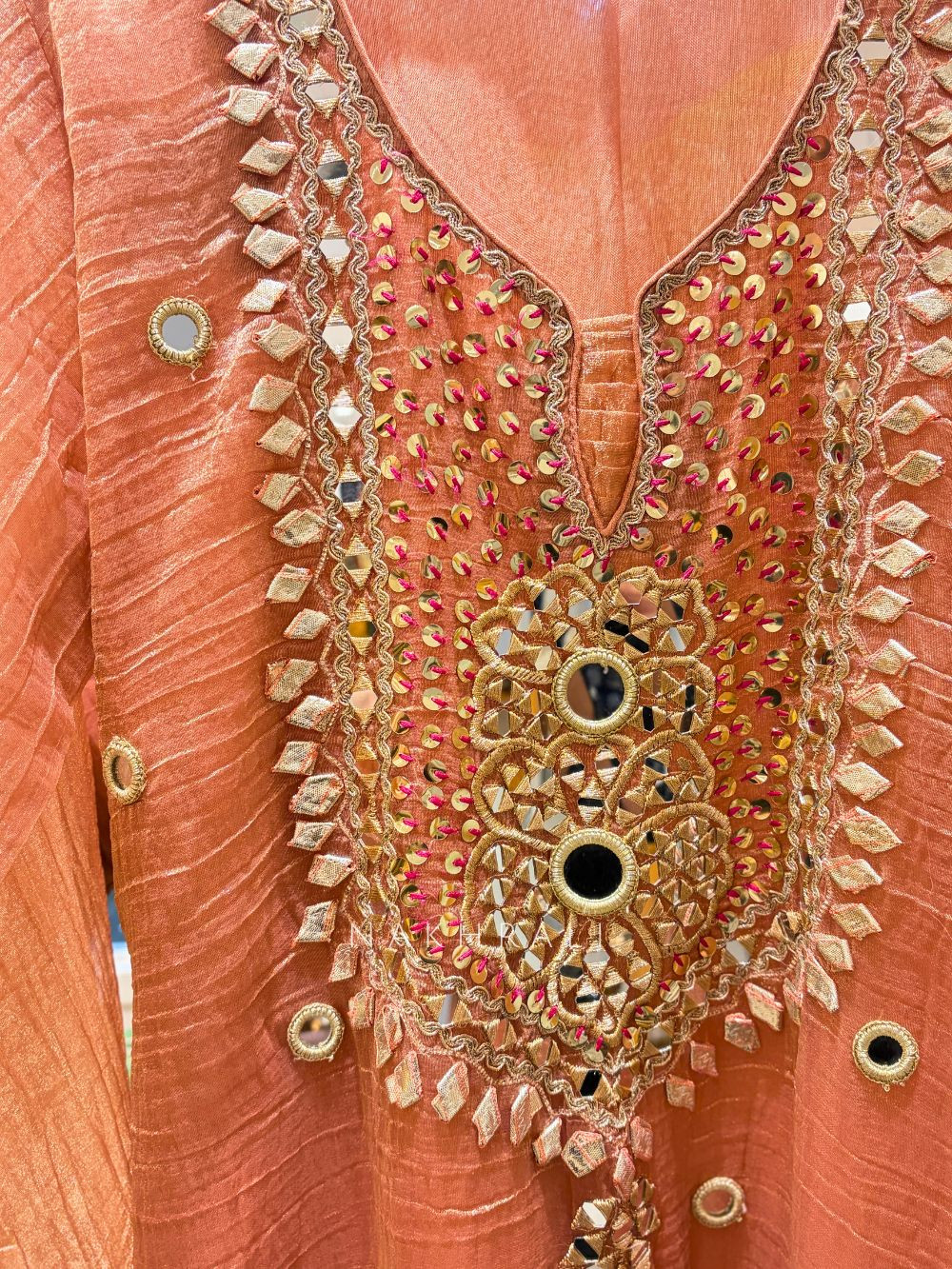 Aisha Peach Tissue Suit Set with Mirror and Gota Patti Work