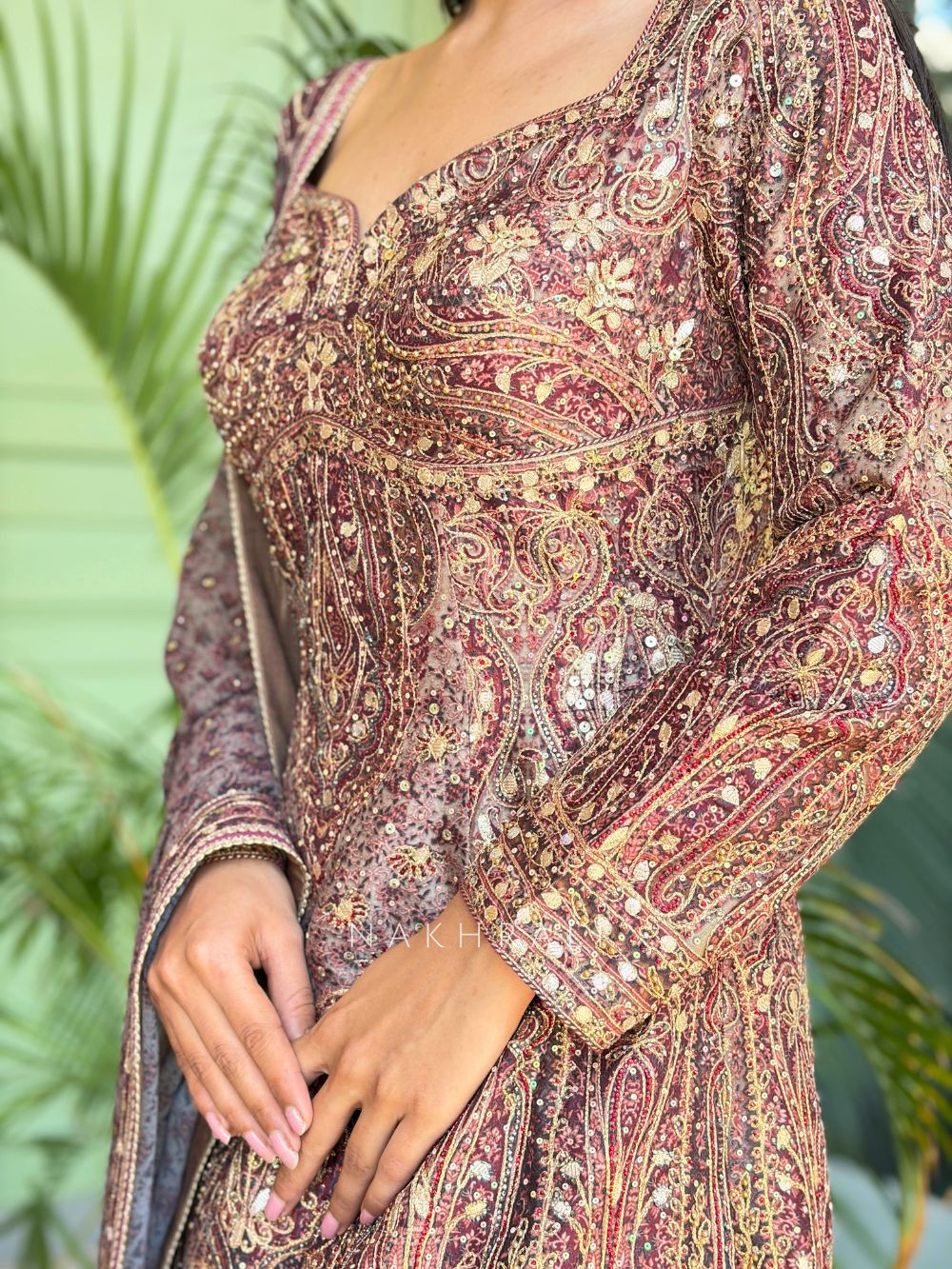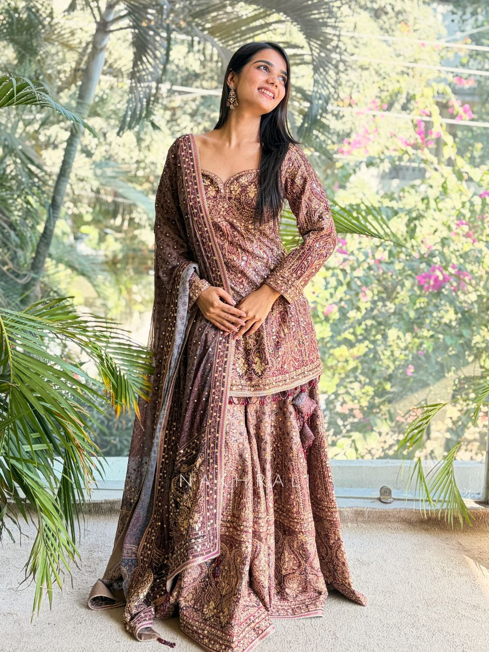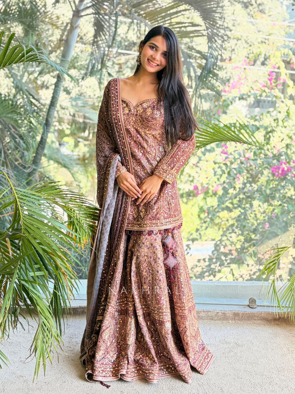This elegant brown suit set features intricate zari, sequin and gota patti embroidery spread across the kurta, creating a luxurious and festive appeal. The neckline and bodice are richly detailed, while the sleeves and hem carry coordinated embroidery for a balanced look. It is paired with a beautifully flared bottom showcasing dense traditional motifs and a matching dupatta finished with fine borders and scattered embellishments. The overall look is regal, festive and perfect for occasions where you want something heavy yet graceful without going over the top.