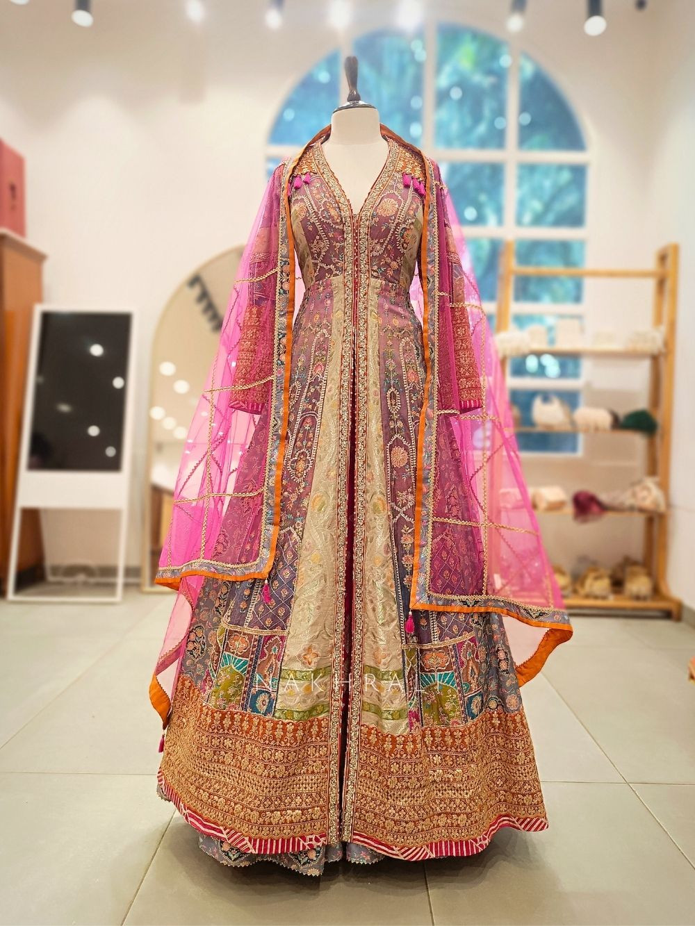 This multicolor achkan lehenga set is designed for women who want something distinctive yet rooted in tradition. The lehenga showcases detailed zari and sequin embroidery enhanced with gota work along the borders, creating depth and festive richness. The achkan-style jacket adds a contemporary layered silhouette, beautifully balancing structure with movement. Thoughtfully crafted panels, ornate sleeve detailing, and intricate surface work make this set ideal for weddings, festive celebrations, and statement occasions where elegance matters.