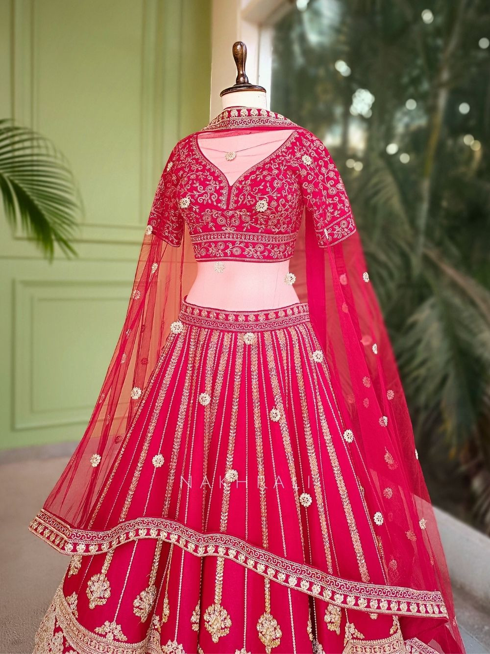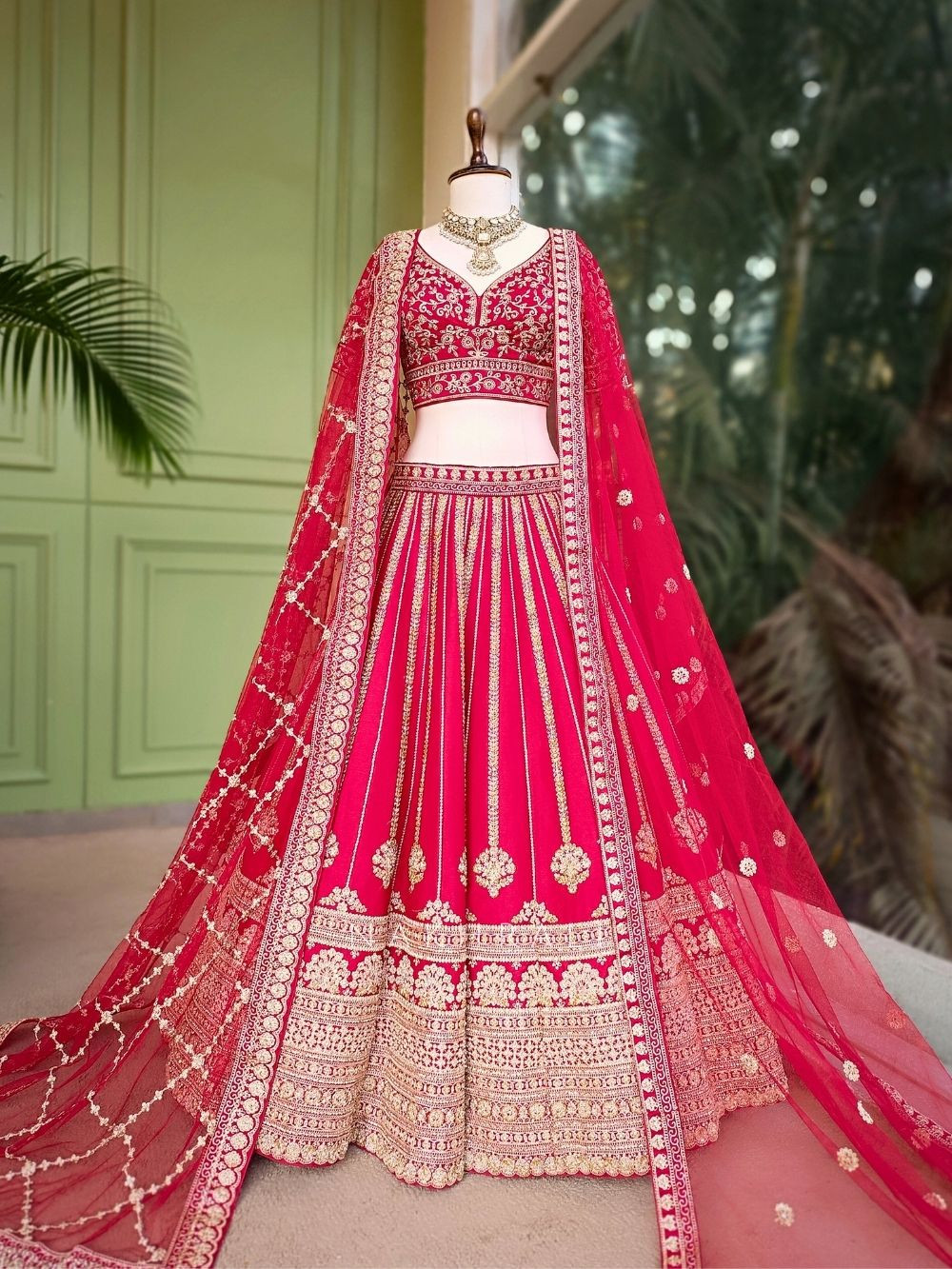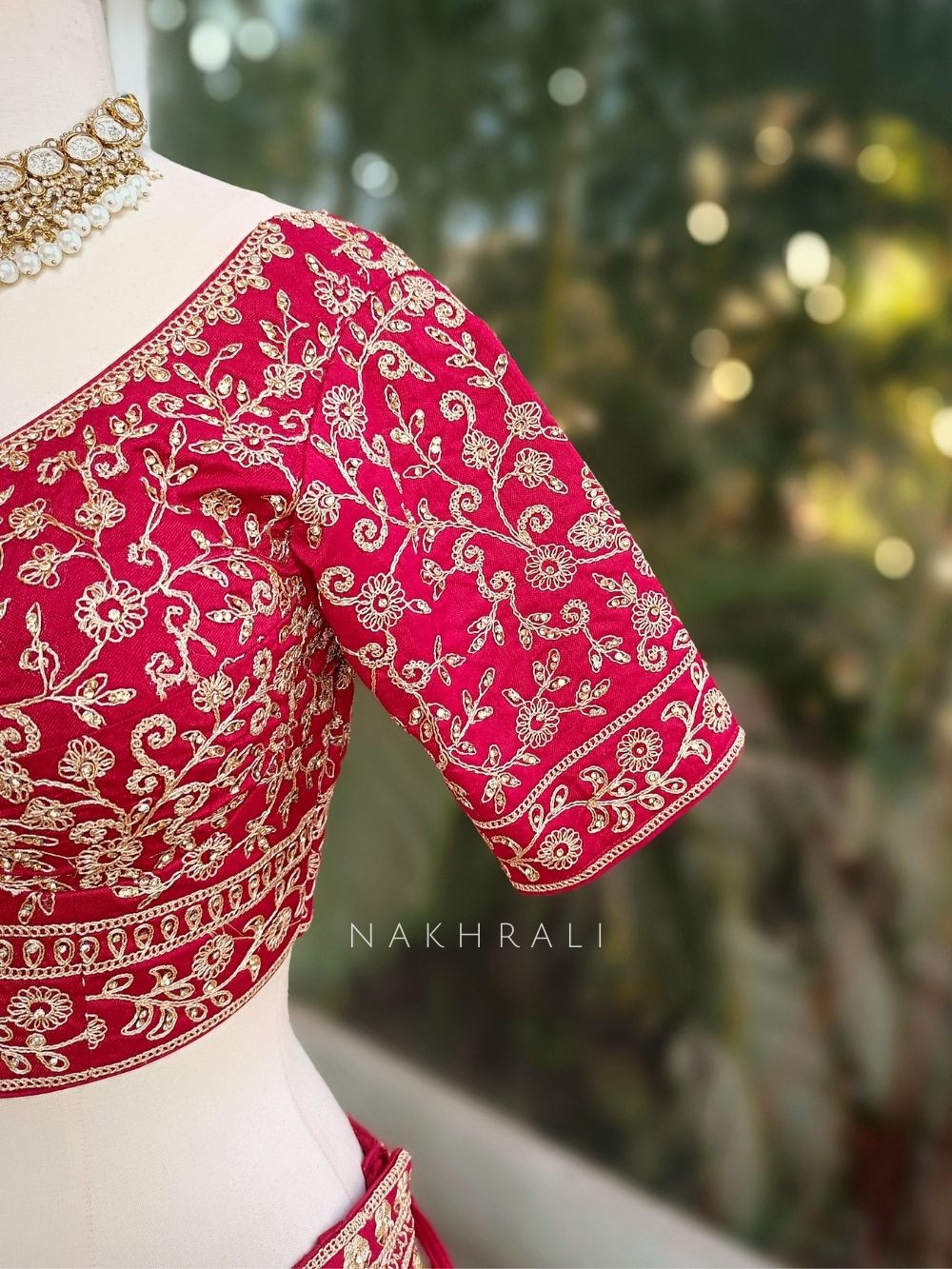 This red bridal lehenga is intricately adorned with all-over zari thread embroidery that creates a rich, structured, and ceremonial bridal appeal. The lehenga skirt showcases evenly placed vertical zari motifs finished with a heavily embroidered hem that adds depth and grandeur. The blouse is crafted with dense zari thread work and a classic neckline, offering a balanced yet striking bridal silhouette. Paired with a sheer embroidered dupatta that enhances the overall look, this lehenga is ideal for brides seeking timeless elegance with traditional craftsmanship.
