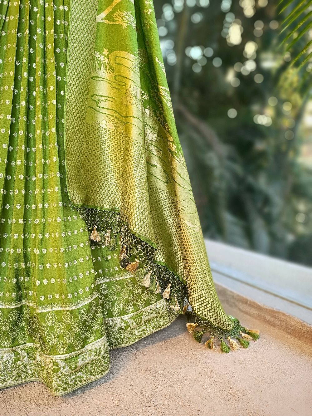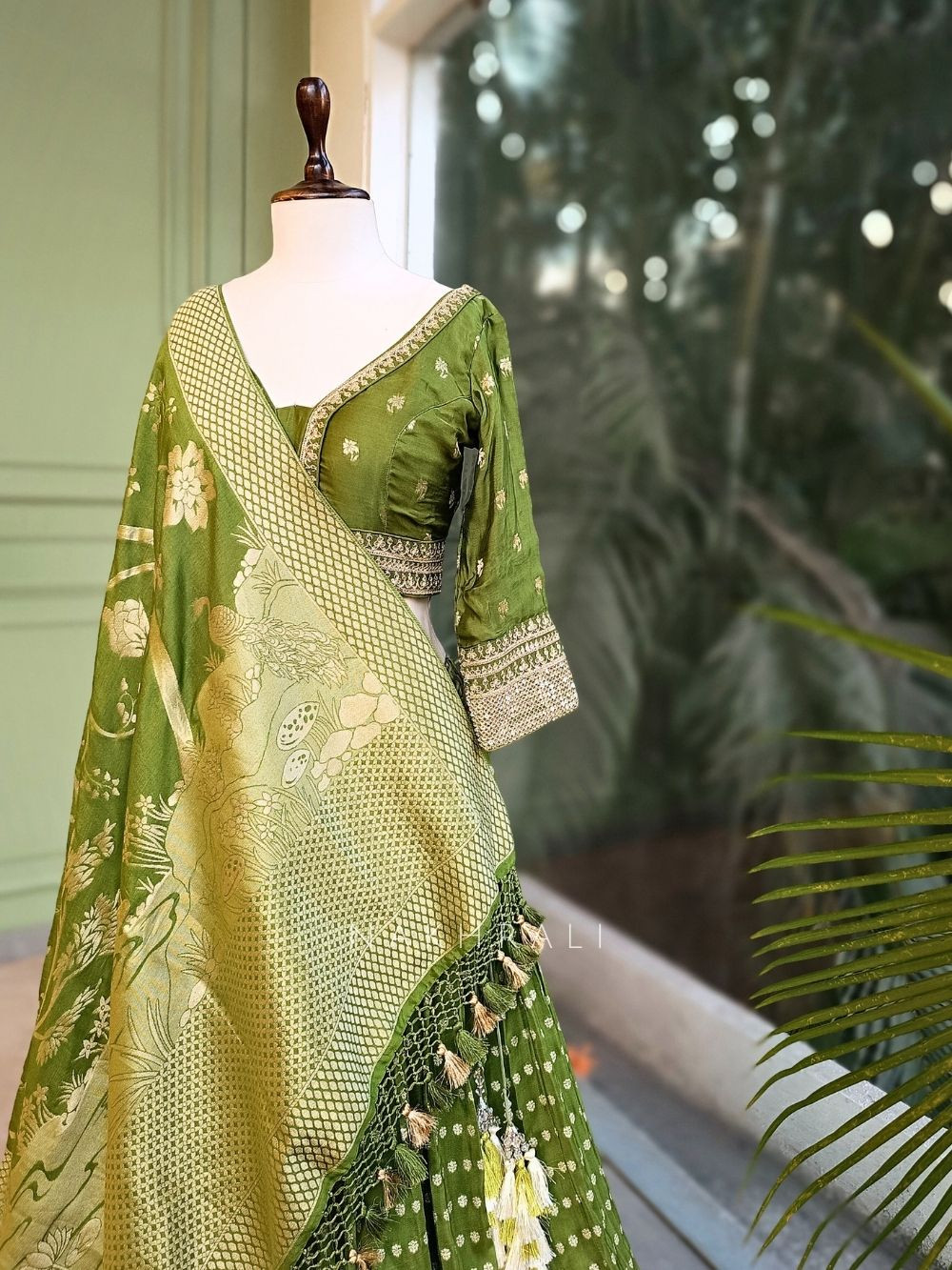This green lehenga set is crafted with intricate brocade patterns highlighted by fine zari work that adds depth without overpowering the silhouette. The blouse features a flattering V-neckline with zari borders, three-quarter sleeves, and a tie-up back detail with tassels. The lehenga skirt showcases evenly placed woven motifs with a detailed brocade hem, creating graceful movement. The matching dupatta is finished with woven designs and tassel accents, completing the look with traditional elegance. Ideal for weddings, festive gatherings, and cultural celebrations.