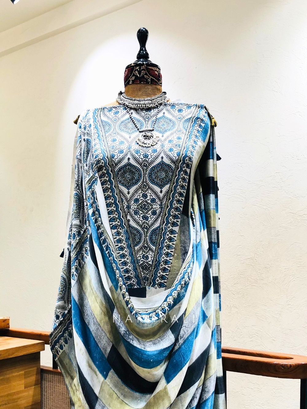 This modal dress material set blends understated beauty with refined comfort. The fabric showcases basic-style prints in cool blue and olive tones, creating a soothing visual balance. Its lightweight, breathable modal base offers fluid drape and all-day ease, while the coordinated patterns elevate the outfit with subtle sophistication. Ideal for daily wear, small gatherings, and easygoing outings, it delivers a polished yet relaxed appeal suitable for every season.