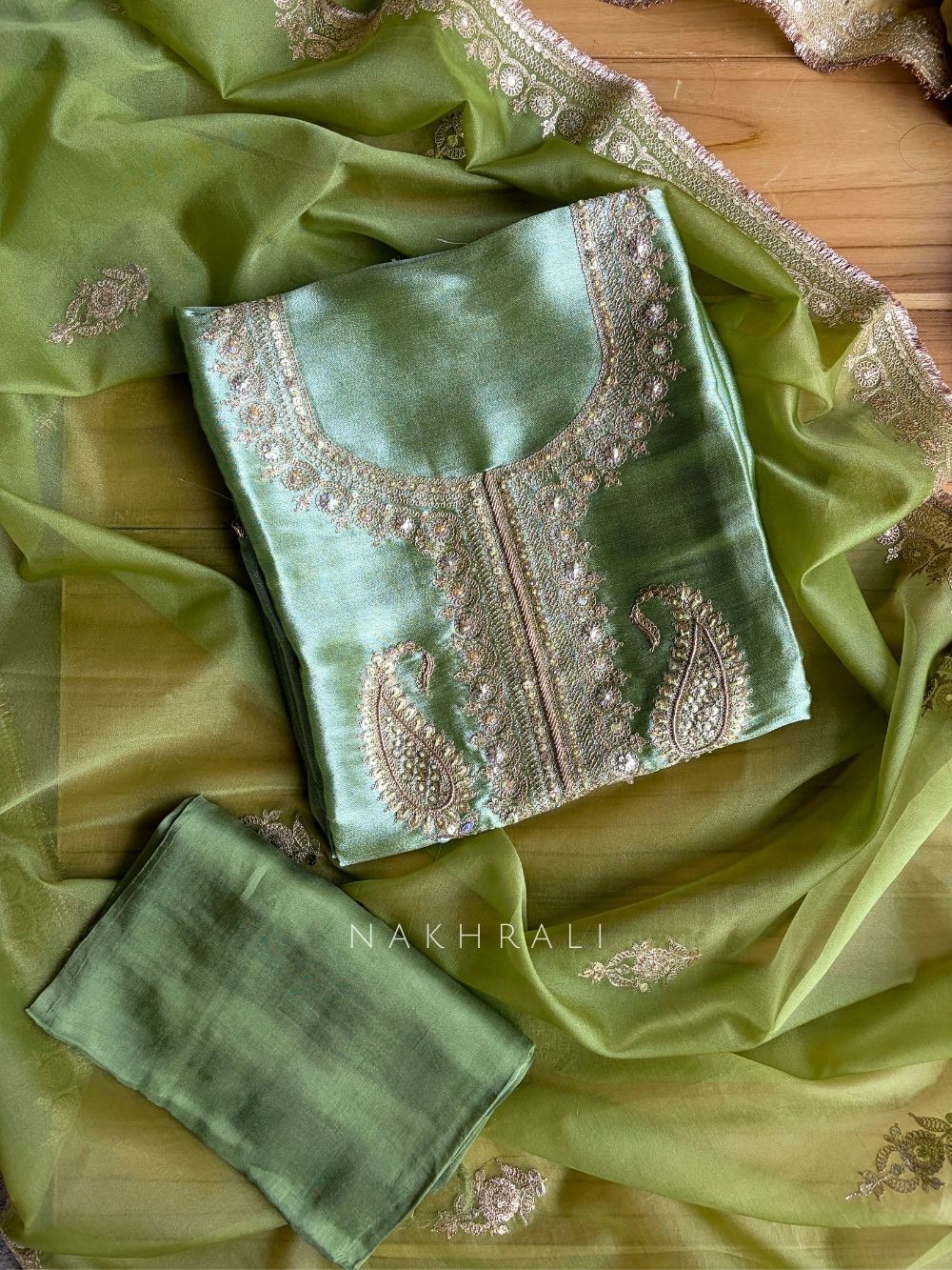 This elegant dress material features delicate paisley embroidery placed along the neckline and body, creating a refined everyday look with subtle festive charm. The design is balanced and wearable, making it ideal for regular wear, office days, and light occasions. Finished with a softly embroidered dupatta border, the set feels graceful without being heavy, allowing it to transition easily from day to evening styling. Fabric Details Kurta Fabric: Soft Chanderi blend with fine embroidery Bottom Fabric: Smooth matching Chanderi blend for comfort and fall Dupatta Fabric: Lightweight organza with embroidered border and motifs Feel: Light, breathable, and comfortable for extended wear