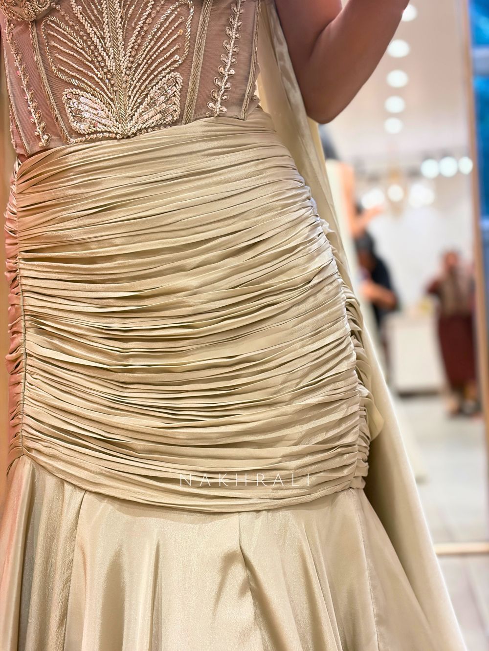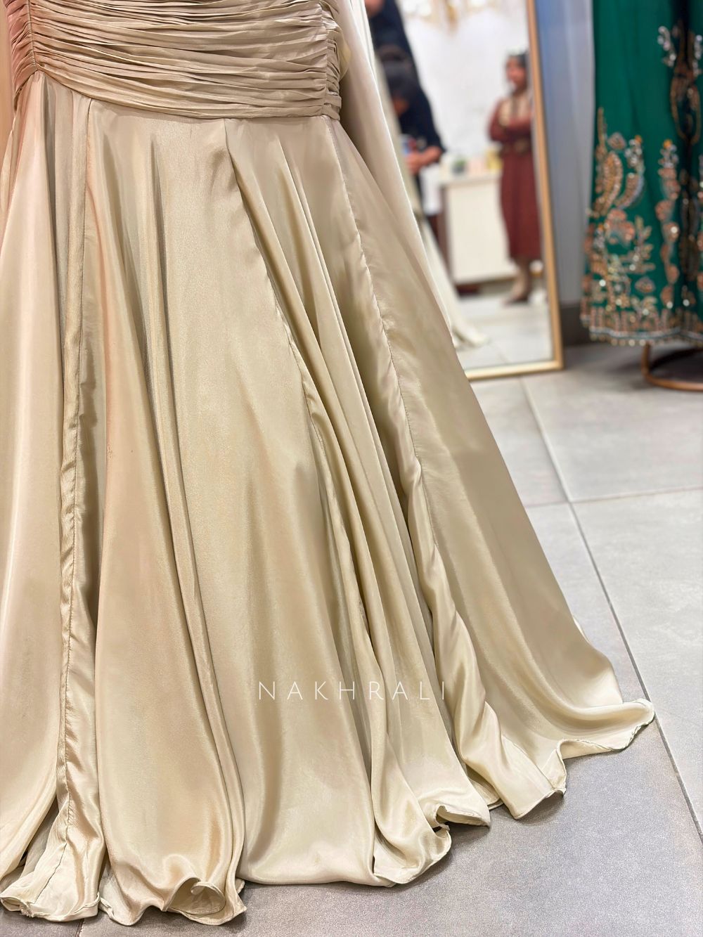 Crafted in a luxe satin-blend fabric, this indo-western lehenga set is designed to make an impact. The corset-style blouse is heavily embellished with fine beadwork, sequins, and cut dana detailing, creating a structured and contoured fit that enhances the silhouette. The sweetheart neckline paired with a choker-style detail adds a contemporary edge. The skirt is tailored in a mermaid silhouette with soft ruching at the waist, flowing into a dramatic flare at the bottom, giving movement and elegance with every step. Finished with a matching drape, this outfit is ideal for cocktail nights, receptions, and statement festive occasions where subtle won’t cut it.