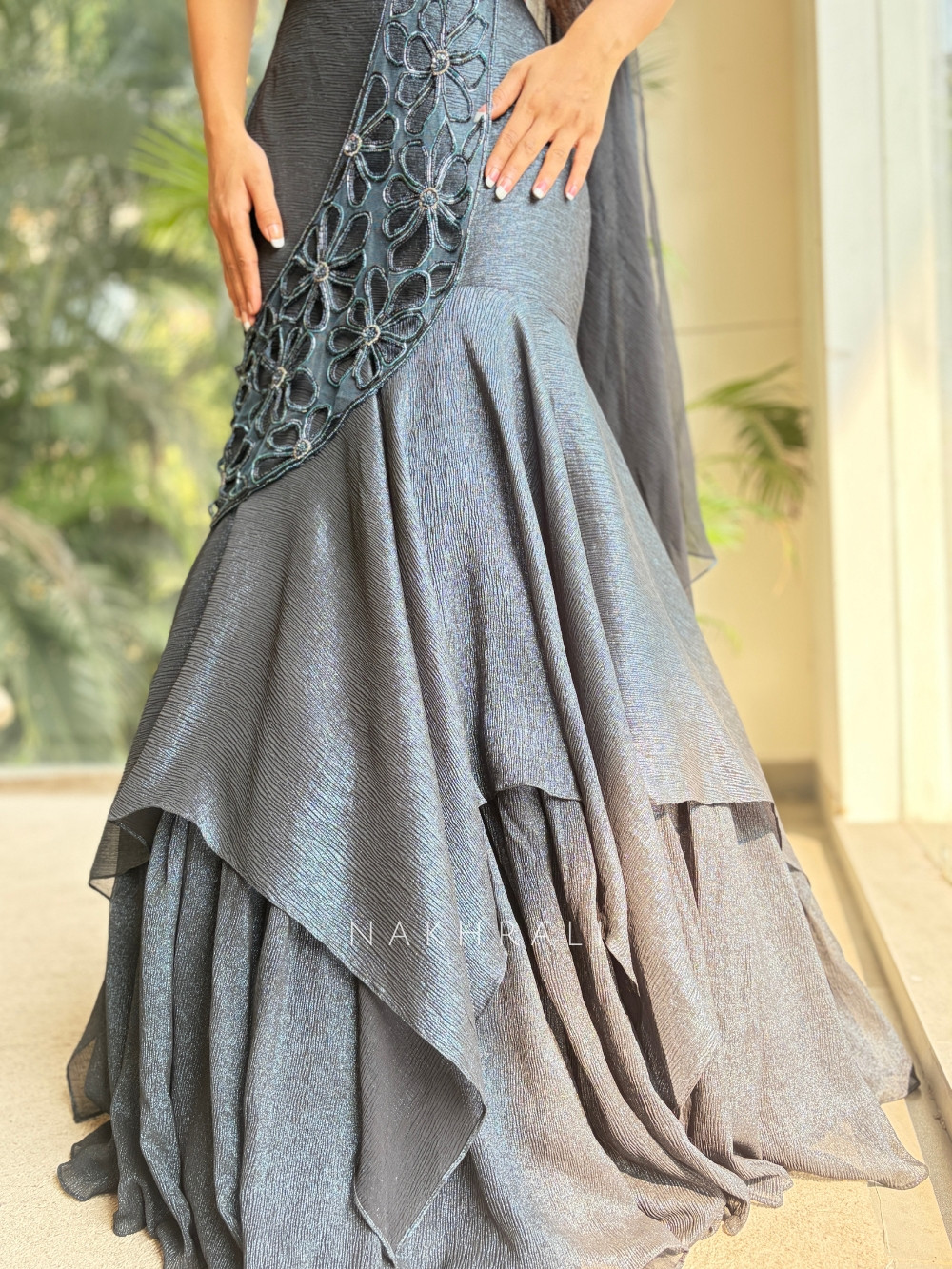 Dry clean only. Store in a muslin cloth away from direct sunlight. Avoid perfume or moisture near embroidery. Do not fold along heavily embellished areas. Steam lightly to maintain fabric texture and fall.