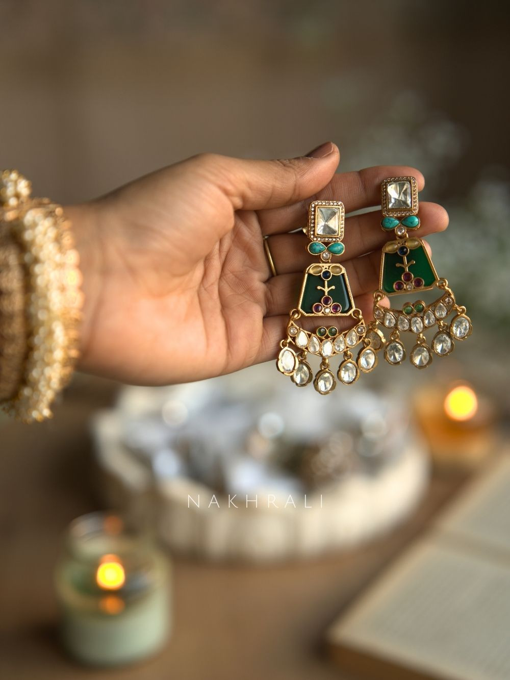 These statement kundan drop earrings are crafted with a structured silhouette, highlighted by finely set stones and delicate hanging drops that create beautiful movement. The balanced design blends traditional detailing with a contemporary finish, making them easy to style across weddings, festive gatherings, and evening celebrations. Available in four color variations, this versatile pair complements a wide range of outfits while maintaining a timeless, elegant appeal.