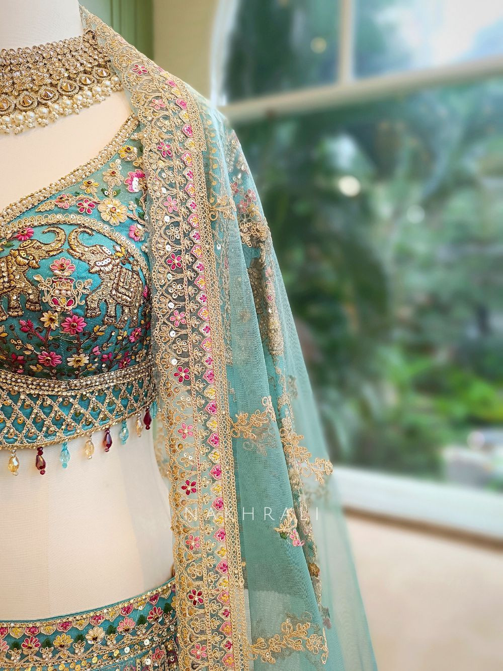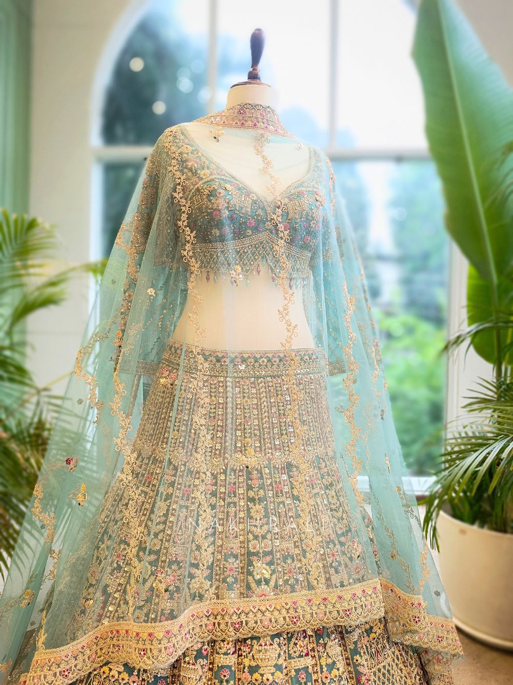 Step into a fairytale with this Aurelia Sky Blue Net Lehenga, crafted to perfection for brides and bridesmaids who love a regal yet dreamy look. The lehenga skirt is richly detailed with zari, sequins, beads, and pastel resham threadwork, creating a striking blend of tradition and elegance. The sky-blue blouse features heavy embellishments with zari and sequins, complemented by sheer embroidered sleeves. Finished with a matching embroidered dupatta, this lehenga is perfect for weddings, receptions, and grand festivities.