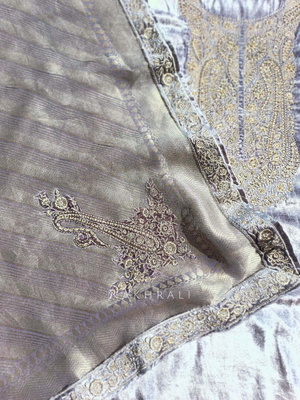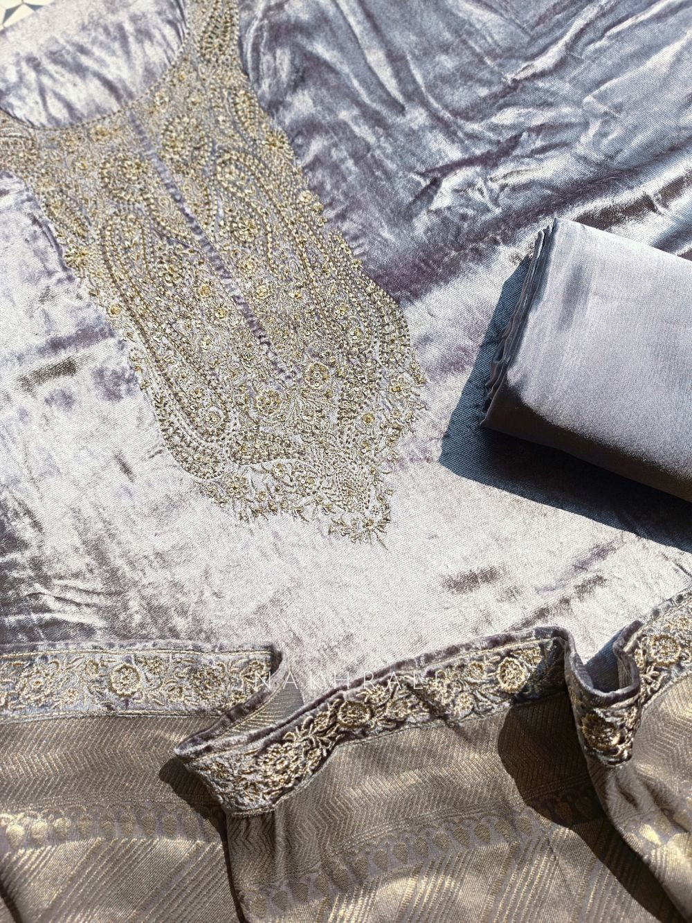 Aureline Grey Velvet Dress Material with Zari Embroidered Work