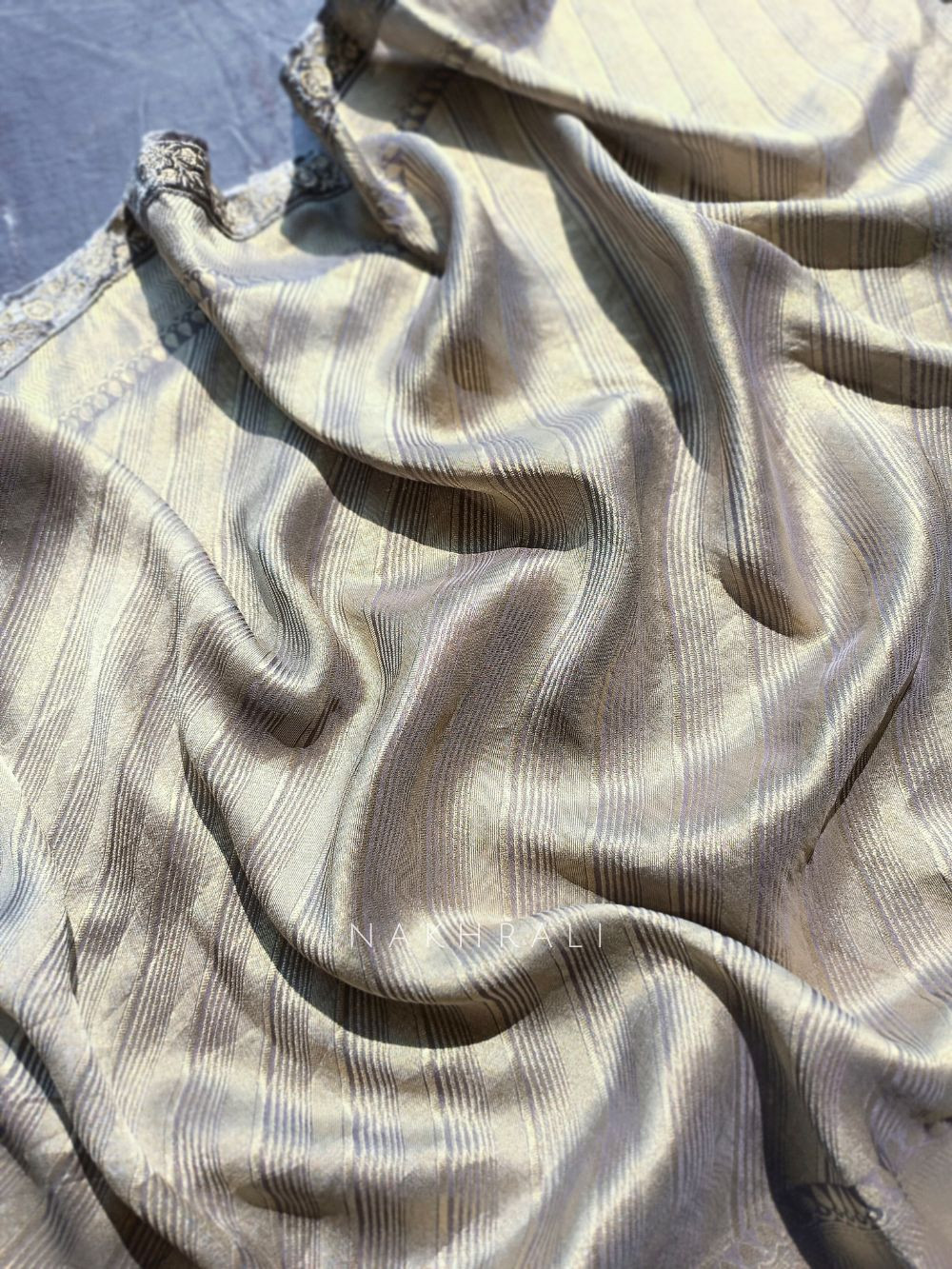 This luxurious grey velvet dress material is crafted with a beautifully detailed zari-embroidered neckline that adds depth and richness to the outfit. The soft velvet fabric offers a plush drape, making it ideal for winter festivities. Its complementing dupatta features delicate woven patterns and an embroidered border that completes the ensemble with elegance. Perfect for weddings, receptions and glam winter functions, this dress material blends comfort with regal craftsmanship.