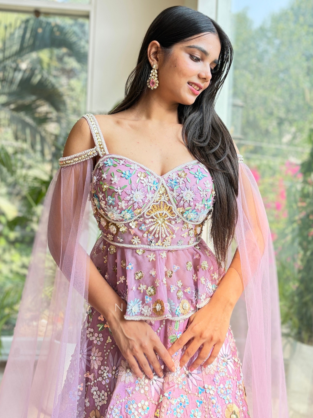 This purple embellished lehenga set showcases detailed floral sequin work across the blouse and skirt, giving it a bright, youthful festive appeal. The structured bustier-style blouse comes with beaded straps and sheer cape sleeves, adding elegance and movement. The lehenga is adorned with multi-hued motifs and reflective highlights that glow beautifully in natural light. Ideal for sangeet, receptions, and high-energy celebrations where you want standout sparkle with comfort.