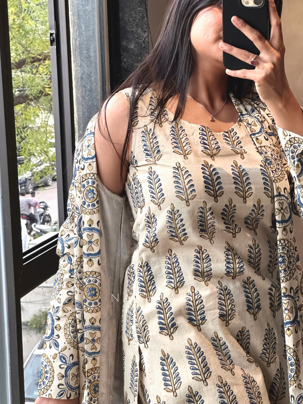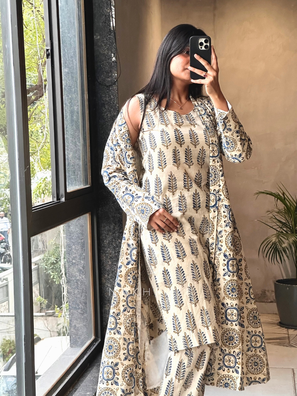 The Autumn Off White Cotton Handblock Co-ord Set with Long Jacket is the epitome of effortless elegance. Crafted from breathable cotton, this three-piece set showcases traditional handblock prints in earthy tones. The sleeveless top and straight-fit pants create a clean silhouette, perfectly layered with a long open jacket featuring intricate motifs. Whether for workdays, art fairs, or relaxed evenings, this ensemble brings together comfort, culture, and contemporary charm.