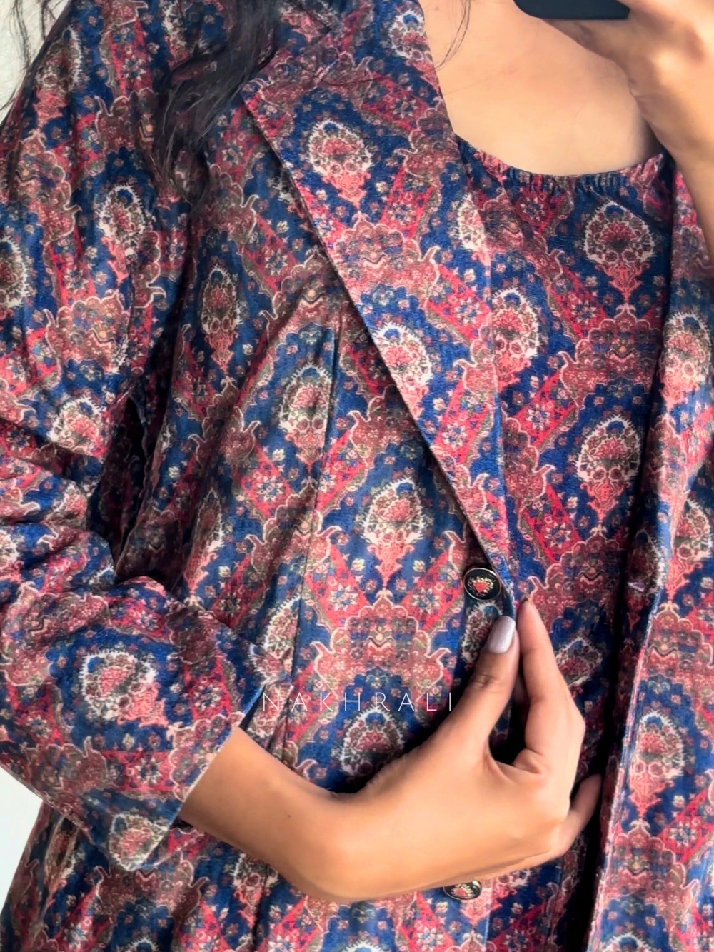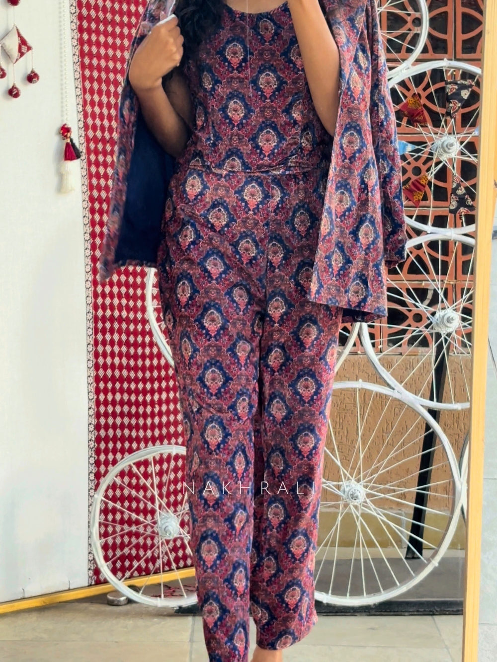 The Aarunya Blue Cotton Coat Pant Set is the epitome of relaxed sophistication. Crafted from premium cotton, it features all-over ethnic-inspired prints in rich blue and maroon tones. The structured coat, tailored pants, and matching sleeveless inner top together create a fusion of modern design and cultural charm. Ideal for art events, brunches, or office gatherings, this set transitions seamlessly from day to evening with a refined yet bohemian vibe.
