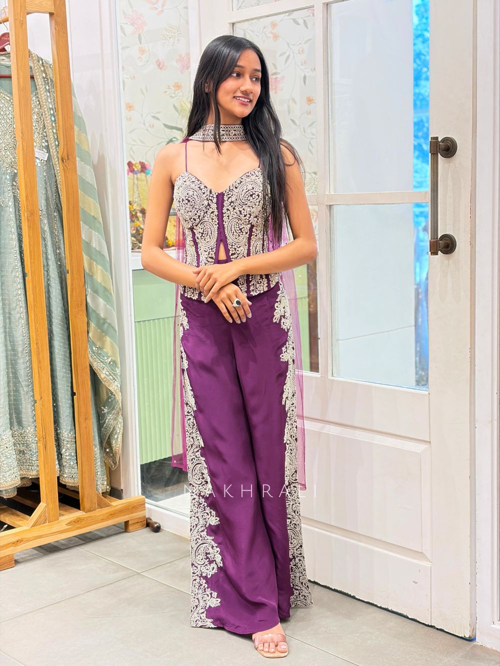 This wine Indo-Western co-ord set is designed for modern occasions that call for elegance with a bold edge. The structured corset-inspired top features detailed embroidery with delicate motifs, accentuated by fine embellishments that add depth and richness. Paired with matching bottoms highlighted by embroidered panels, the set balances sharp tailoring with traditional craftsmanship. The silhouette is flattering yet comfortable, making it ideal for evening celebrations, cocktail functions, and festive gatherings where you want to stand out without going over the top.