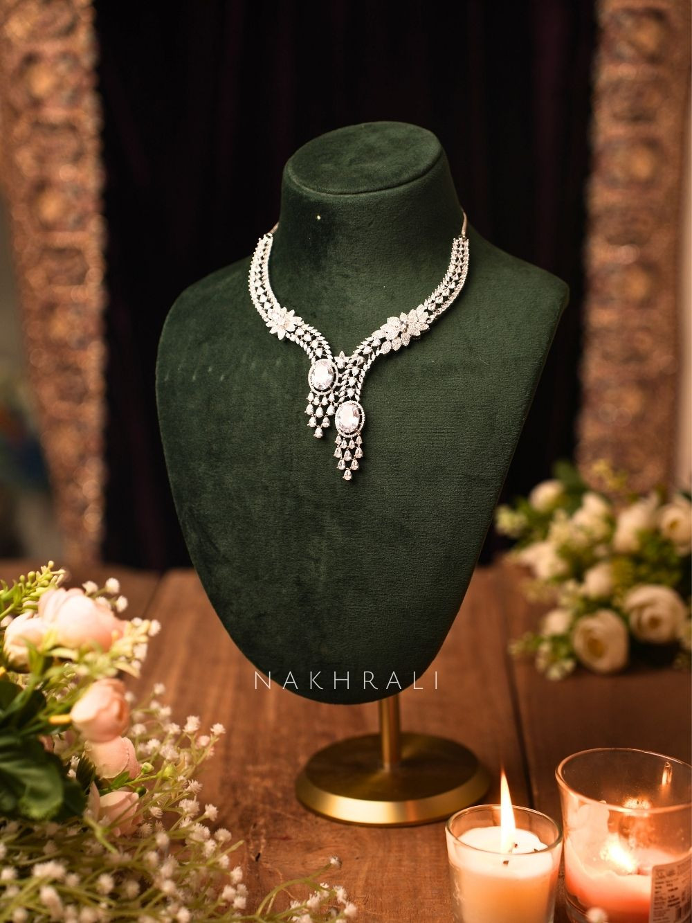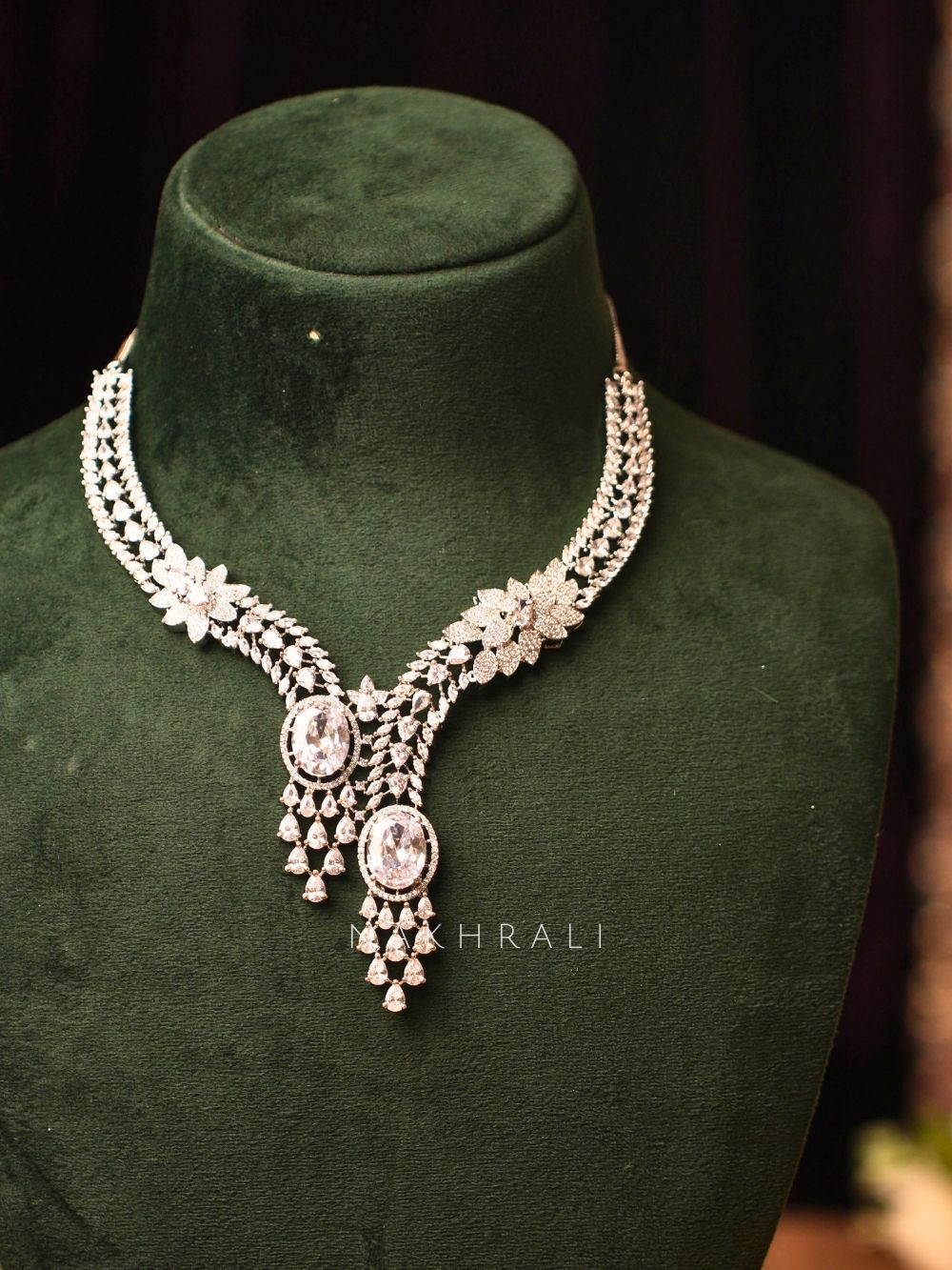 A luxurious Silver Diamond necklace set crafted with oval-cut green stones, a crystal-lined setting, and elegant teardrop detailing. The sleek and sophisticated silhouette makes it a perfect pick for formal occasions, receptions, and grand celebrations. The matching earrings add a finishing touch to this dazzling piece.