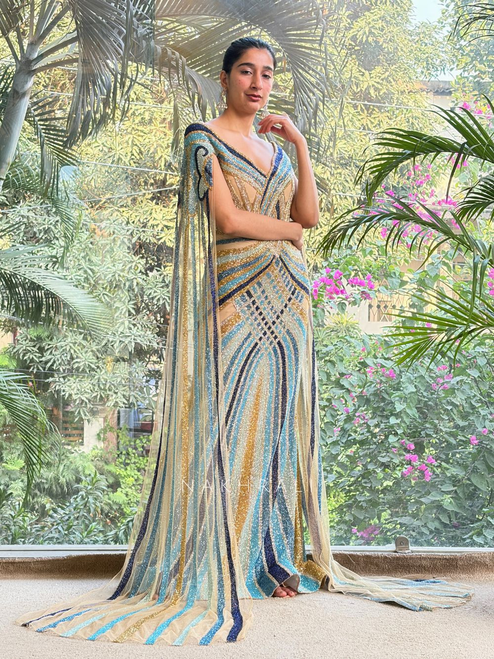 "Blue Mist Gown: Enveloped in the mystique of early dawn mist, this gown is a blend of mystery and elegance, a perfect companion for enchanting nights where every dance step stirs the air, weaving magic into the moonlight."