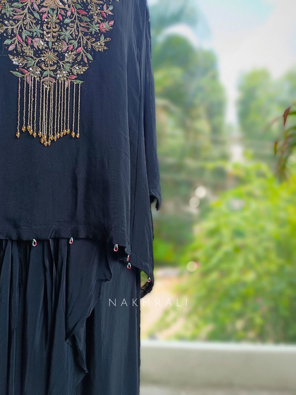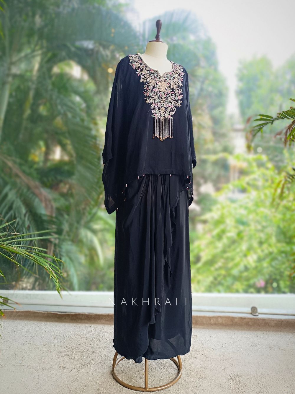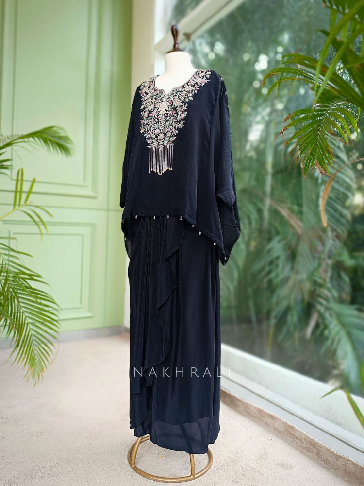 The Bold Noir Kaftan and Skirt Set is a striking fusion of tradition and modern style. Designed in an elegant black tone, the kaftan features intricate embroidery that adds a refined touch, while the skirt flows gracefully to create a flattering silhouette. The combination exudes sophistication, making it ideal for festive occasions, evening soirees, and cultural gatherings. Effortlessly stylish, this set blends comfort with grandeur, ensuring you make a powerful statement wherever you go.