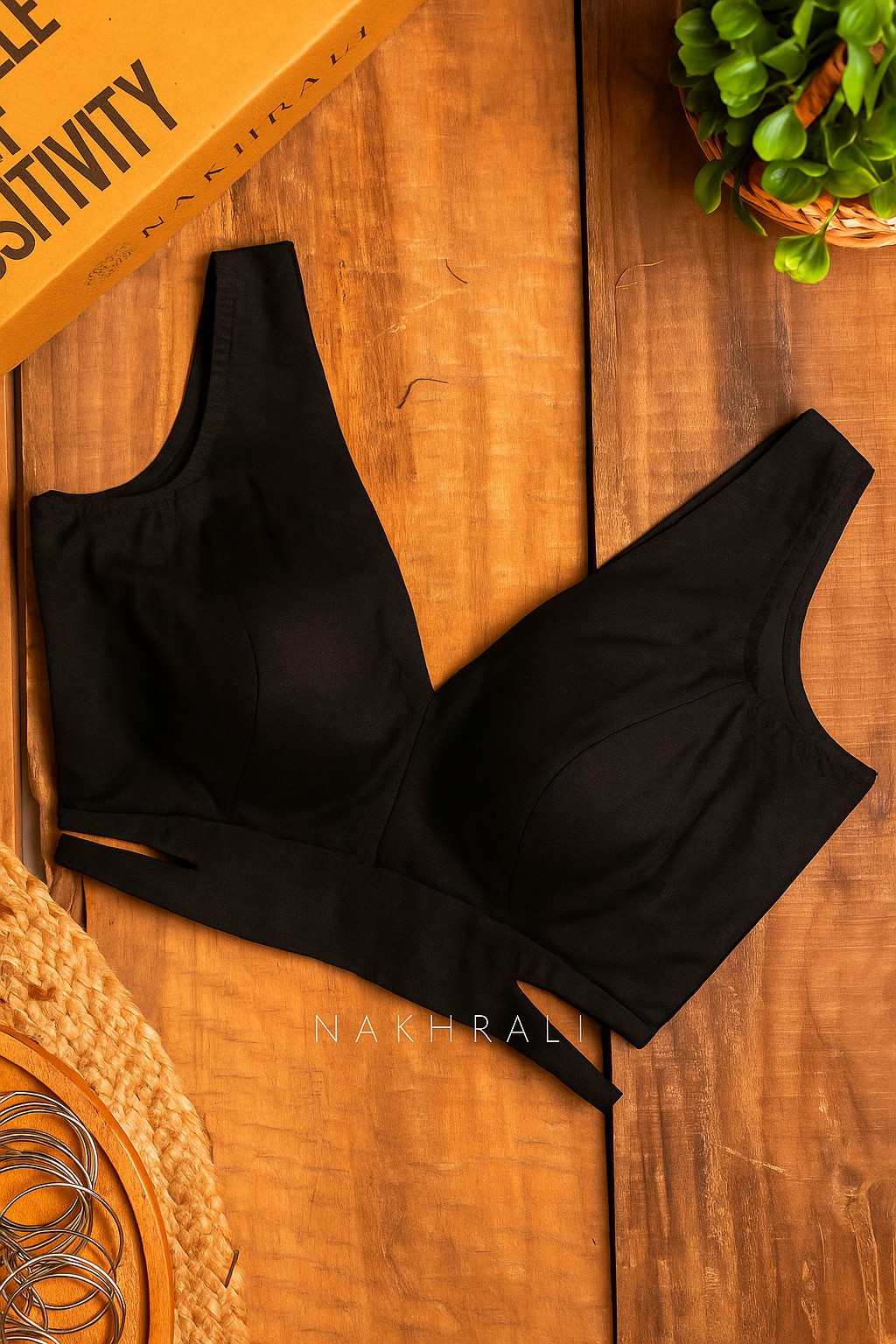 Bombshell was born from a vision to blend bold modernity with timeless retro charm. Designed in a deep Black, it features a striking V-neckline and sharp side cuts that embody unapologetic confidence. The structured silhouette takes cues from vintage icons who redefined elegance in their time — offering a fresh take on classic glamour. Named Bombshell for a reason, this blouse balances fearless attitude with old-school allure, making it the perfect companion to sarees, lehengas, or high-waisted skirts when you want all eyes on you.