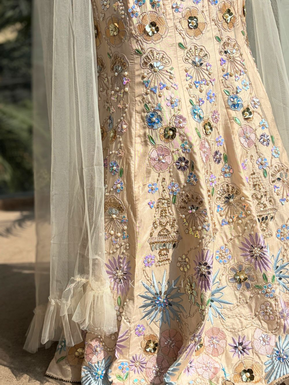 This beige Indo-Western lehenga set blends elegance with contemporary design through its intricately beaded and sequin-embellished bodice. The sculpted neckline and pearl-detailed straps elevate the look, while the sheer cape sleeves add movement and drama. The lehenga’s subtle flare and surface detailing create a refined yet striking silhouette. Light, graceful and full of handcrafted charm, this set is perfect for receptions, sangeet nights and modern festive celebrations.