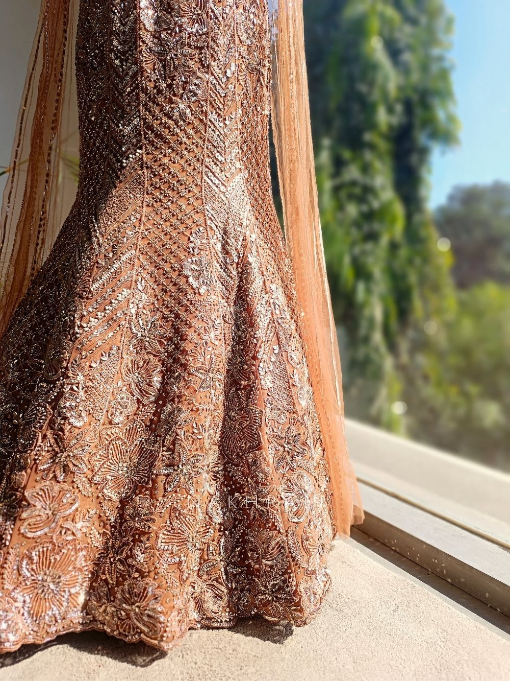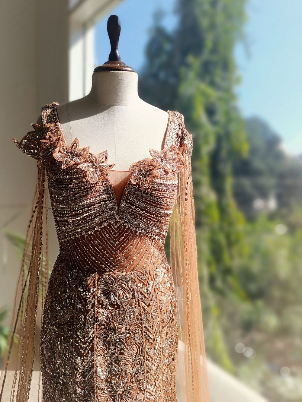 Calysta is a statement bridal gown crafted for brides who want elegance without excess. Designed in a rich brown tone, this gown features intricate all-over embroidery using shimmering sequins, cut dana, and stone detailing that adds depth and dimension. The structured bodice highlights the neckline with delicate embellishments, while the flowing skirt creates a graceful, elongated fall. Soft sheer accents along the shoulders and back add balance to the heavily worked surface, making it ideal for bridal entries, reception nights, and couture wedding celebrations.
