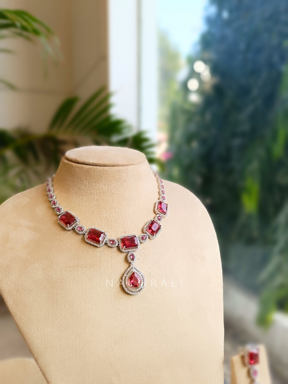 This elegant necklace set features deep crimson stones framed with shimmering micro-crystals, offering a bold yet refined look. The centre teardrop pendant adds a classic touch, while the matching earrings complete the set with perfect balance. Designed for brides, evening functions and cocktail outfits, this piece brings effortless sophistication and a luxurious pop of colour to any ensemble.