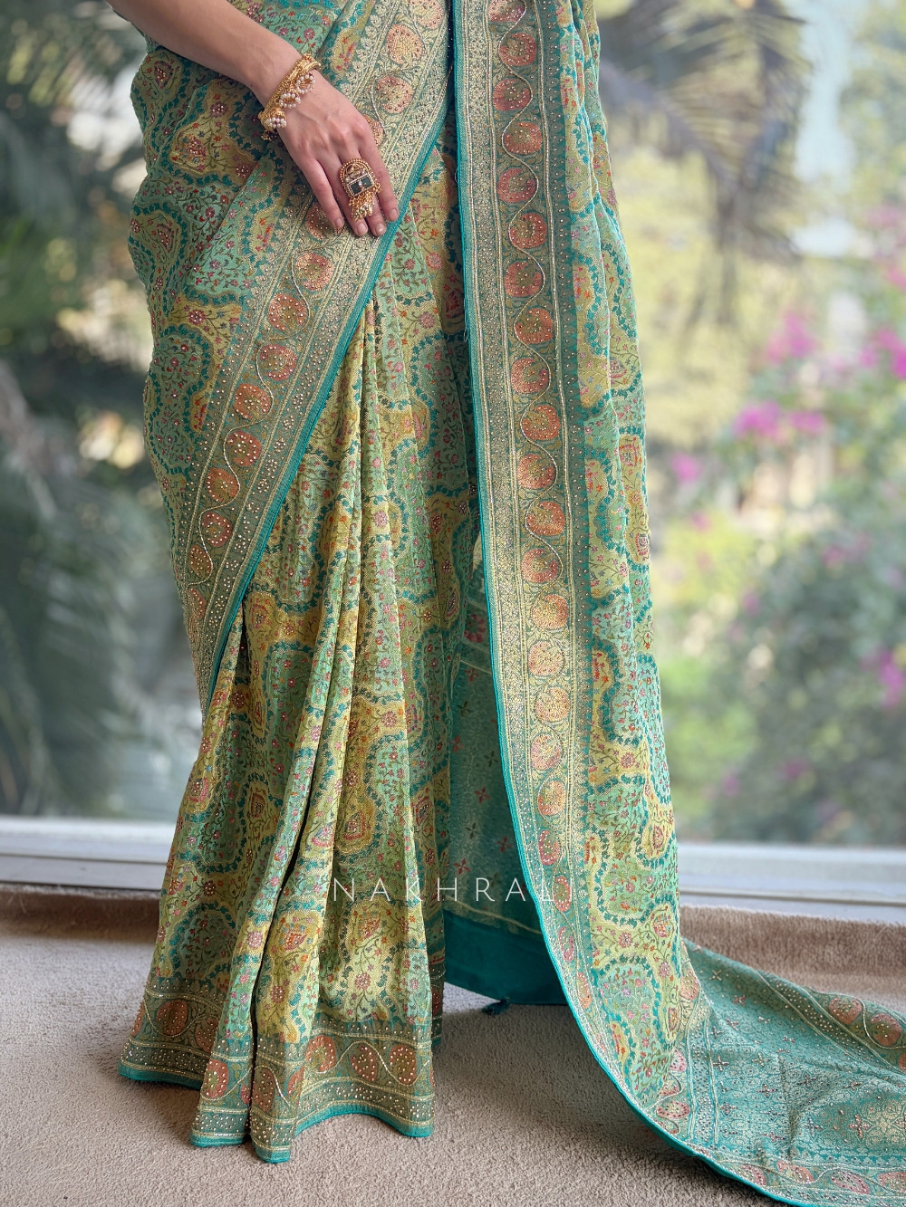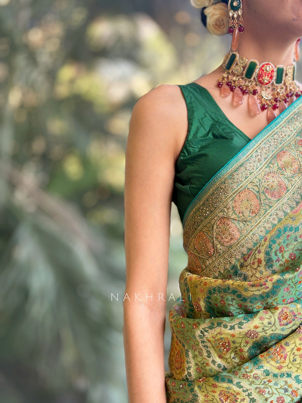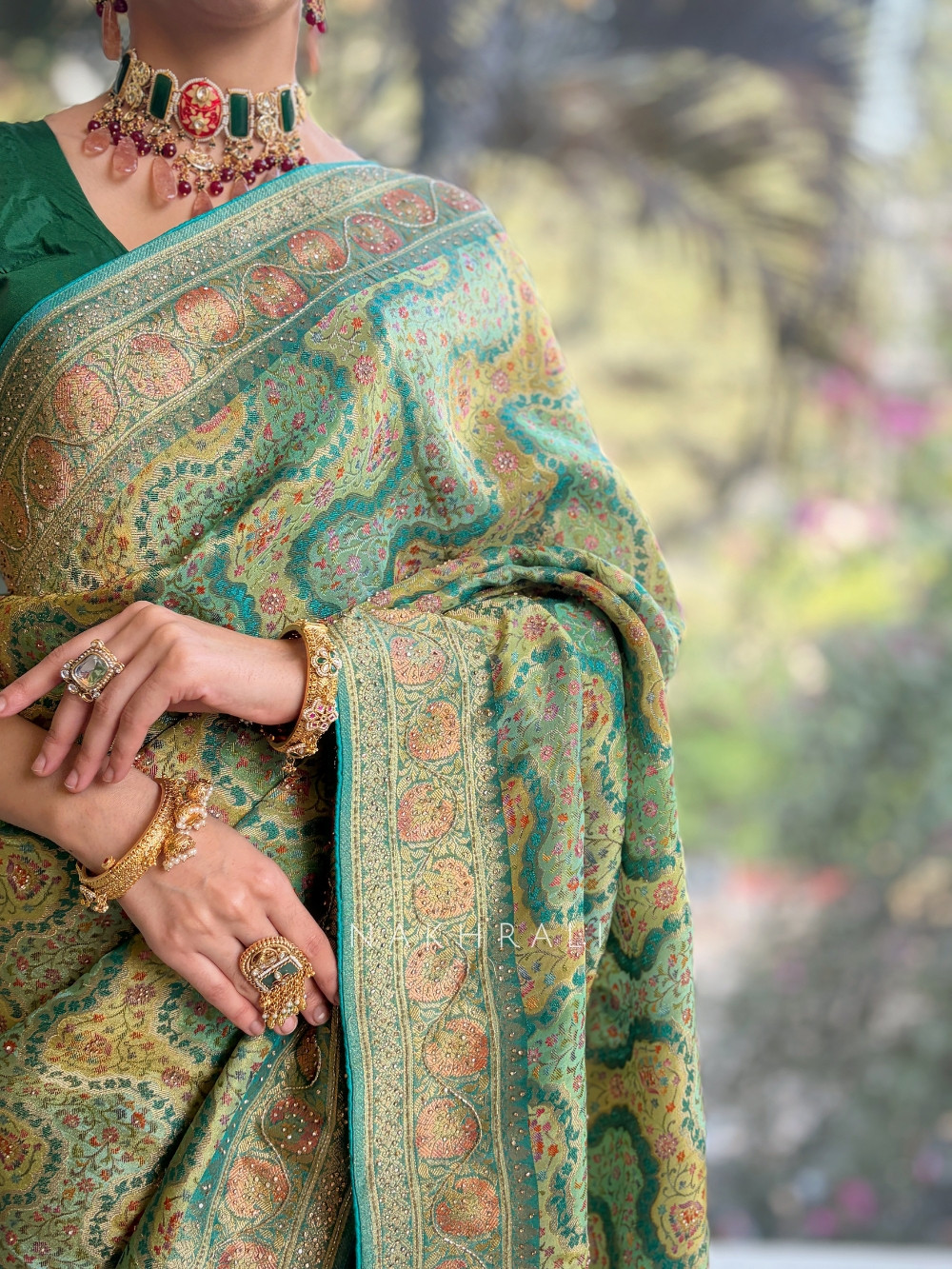 The Chaarvi Sea Green Banarasi Silk Saree is a masterpiece of traditional artistry. Crafted from luxurious Banarasi silk, this saree showcases detailed brocade patterns woven in golden zari and subtle threadwork. The elegant Rama green hue adds sophistication, while the intricate pallu and border enhance its royal appeal. Ideal for festive gatherings, wedding functions, or cultural occasions, this saree captures the essence of heritage elegance with a modern charm.