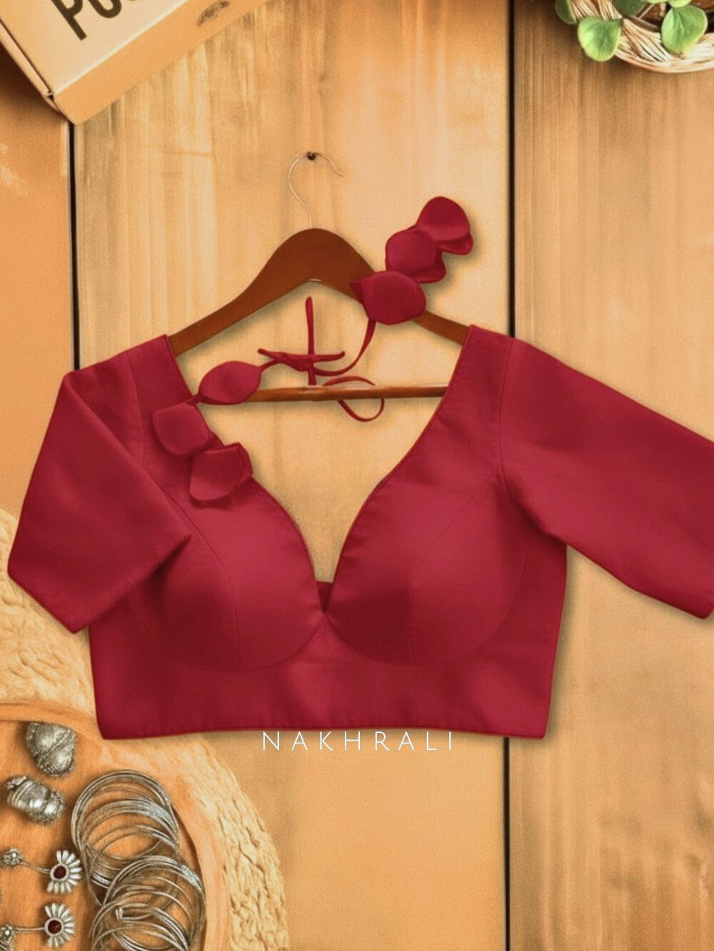 The Chandani blouse in red brings a striking blend of tradition and contemporary elegance. Crafted in soft cotton, it features a flattering sculpted cup design and clean half sleeves that enhance its structured look. The handcrafted petal tie-back detail adds a romantic, designer touch, making the blouse a standout piece. Ideal for weddings, festive occasions, and special celebrations, this versatile blouse pairs beautifully with printed sarees, silk drapes, and lehenga skirts, delivering a bold yet graceful finish.