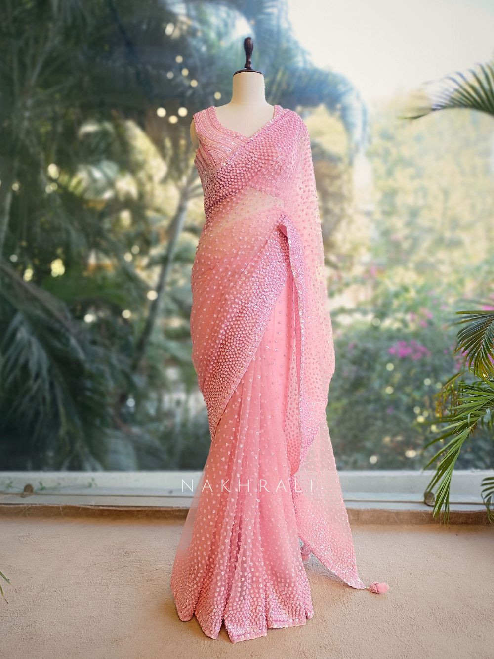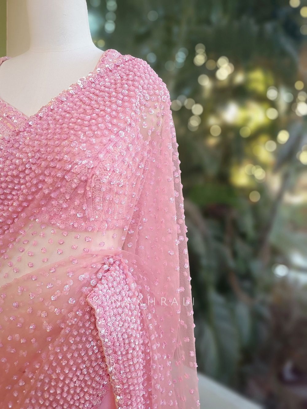 Chandelier Pink Net Saree with Sequin and Cut Dana Blouse