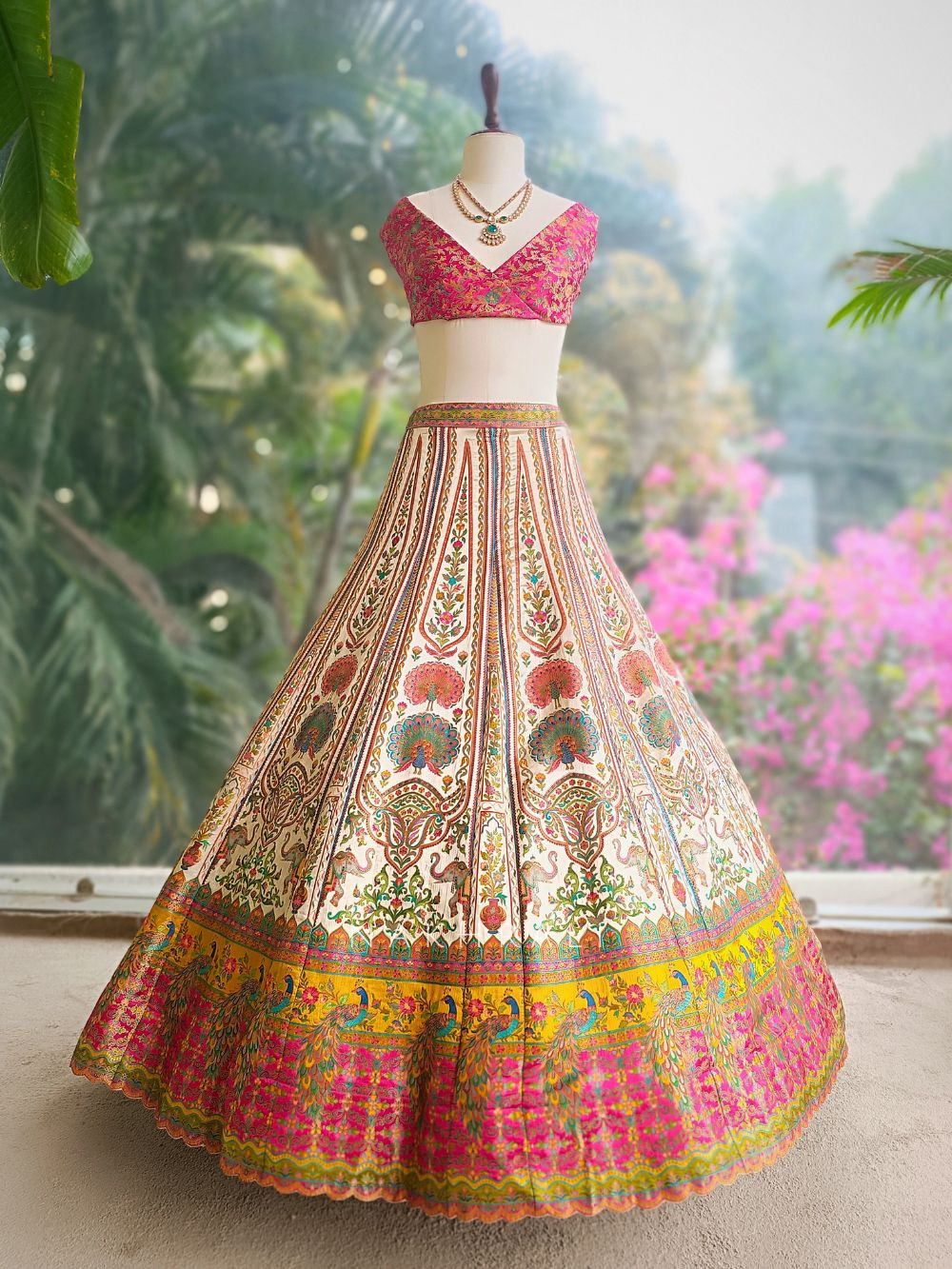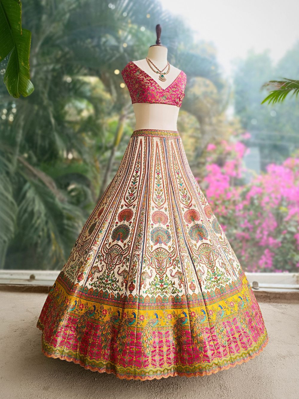 This unstitched lehenga set stands out with its rich all-over motifs arranged in vertical panels, highlighted by peacock and floral elements along the hem. The cream base keeps it elegant while the vibrant accents add depth and celebration. Paired with a contrasting dupatta featuring woven motifs and an ornate border, this set allows complete freedom for custom stitching. Ideal for weddings, festive functions, and heritage celebrations where traditional artistry meets personalised tailoring.