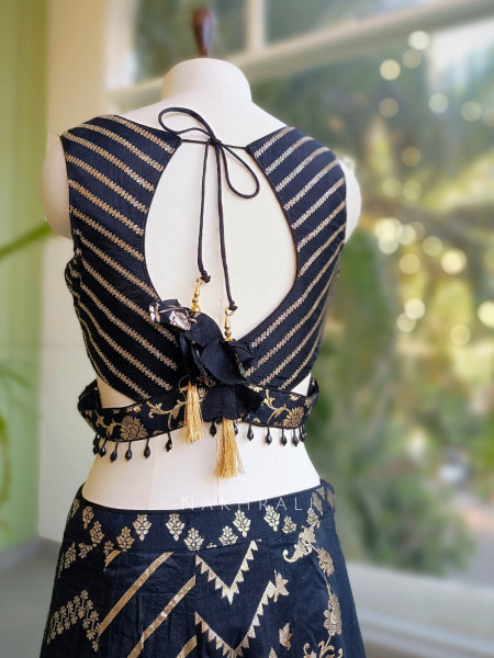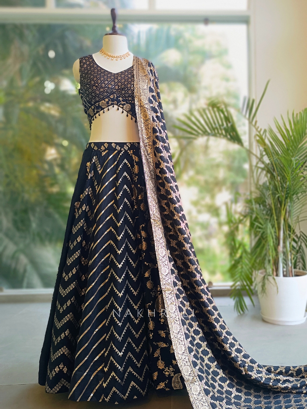 A graceful Classic Glaze Black Dola silk lehenga featuring brocade work, paired with a sequined blouse. Perfect for wedding occasions like sangeet and receptions.