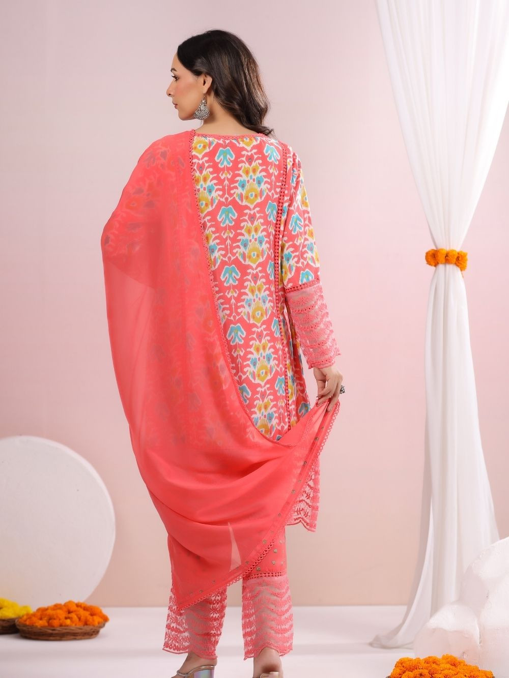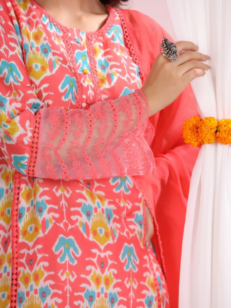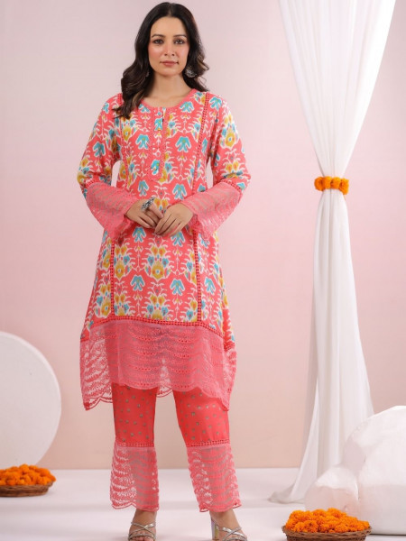 Coral Bloom Peach Printed Cotton Suit Set with Lace Accents